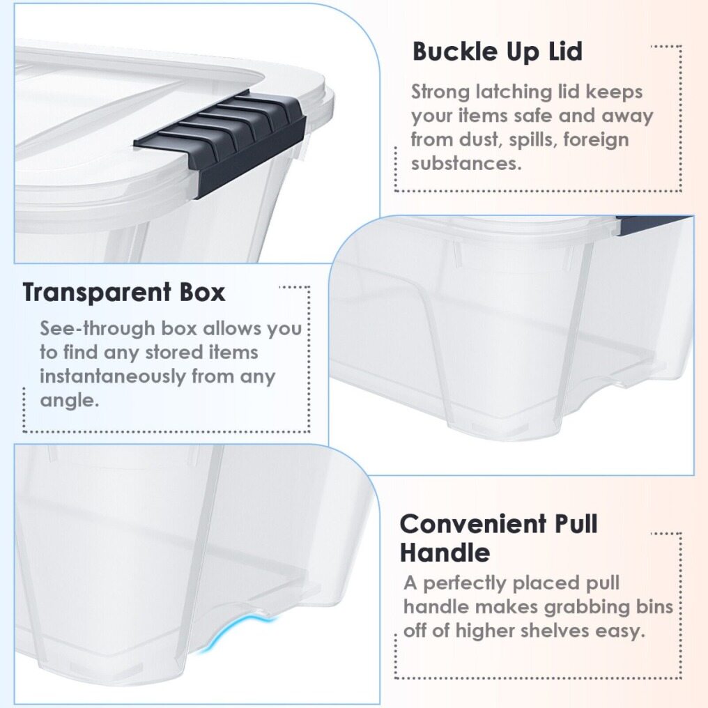 - Sturdy plastic bin with buckle up latches secure contents inside