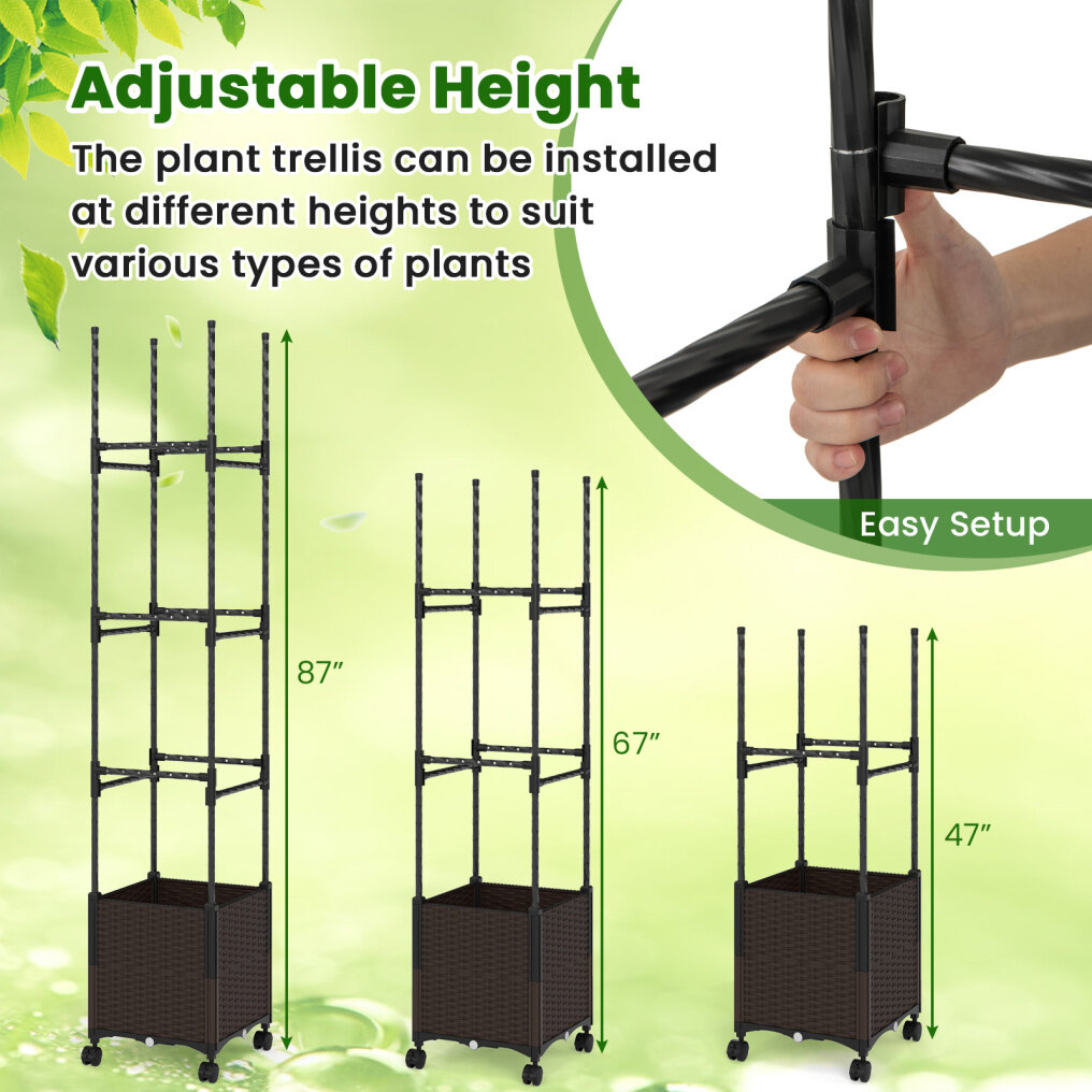 ● Adjustable Size and Easy Setup: The planter box with trellis comes with 3 adjustable heights (87"/67"/47"), while the height of supporting rings is also adjustable by moving up and down, which could adapt to accommodate plants at every stage of their growth journey. With its simple structure, the planter is easy to set up and take down, no tools required.