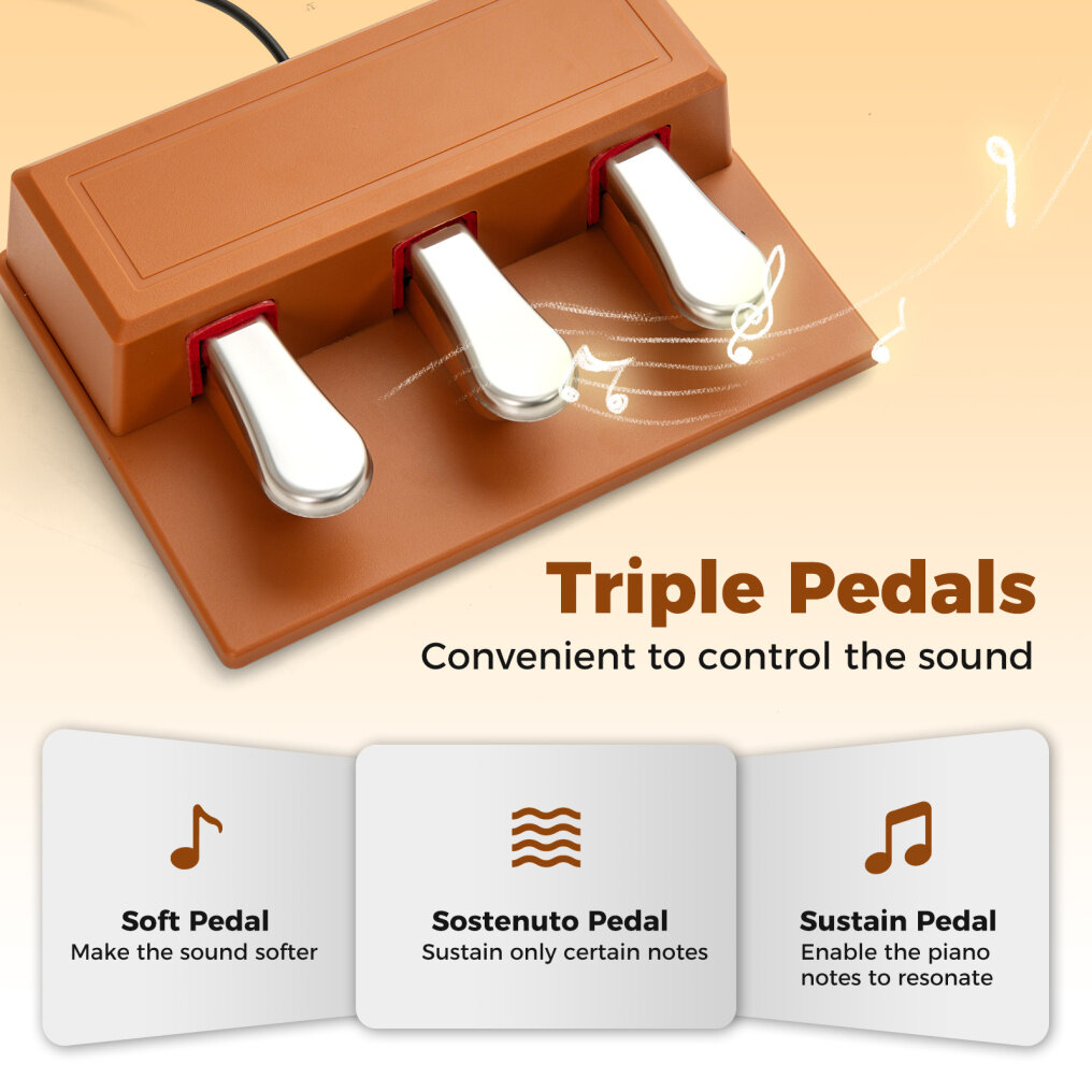 ● Dual Keyboard Mode and Triple Pedals: You can press the "Split" key to enter the dual keyboard mode for duet playing for abundant tones. The electric piano also comes with triple piano pedals, including soft pedal, sostenuto pedal, and sustain pedal.