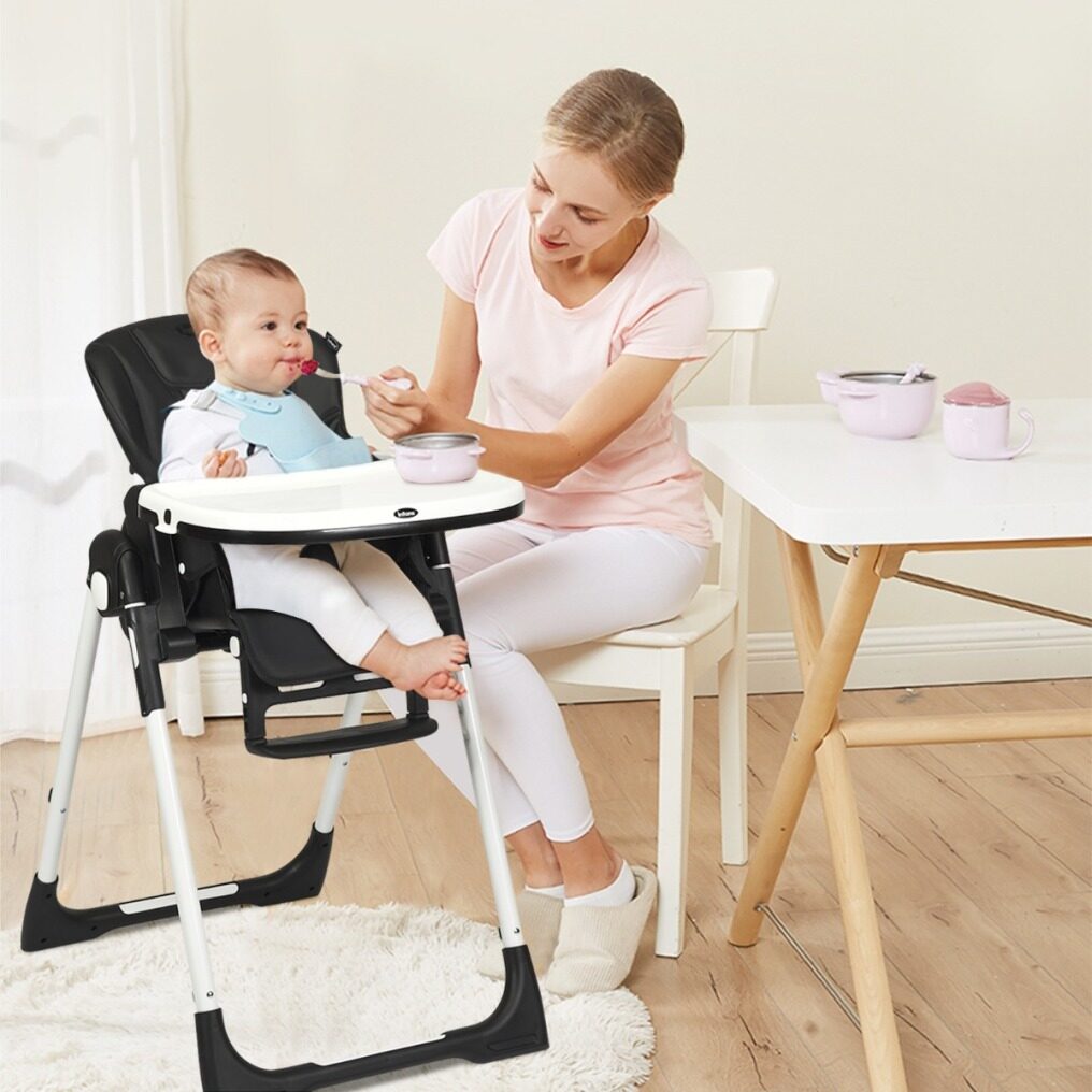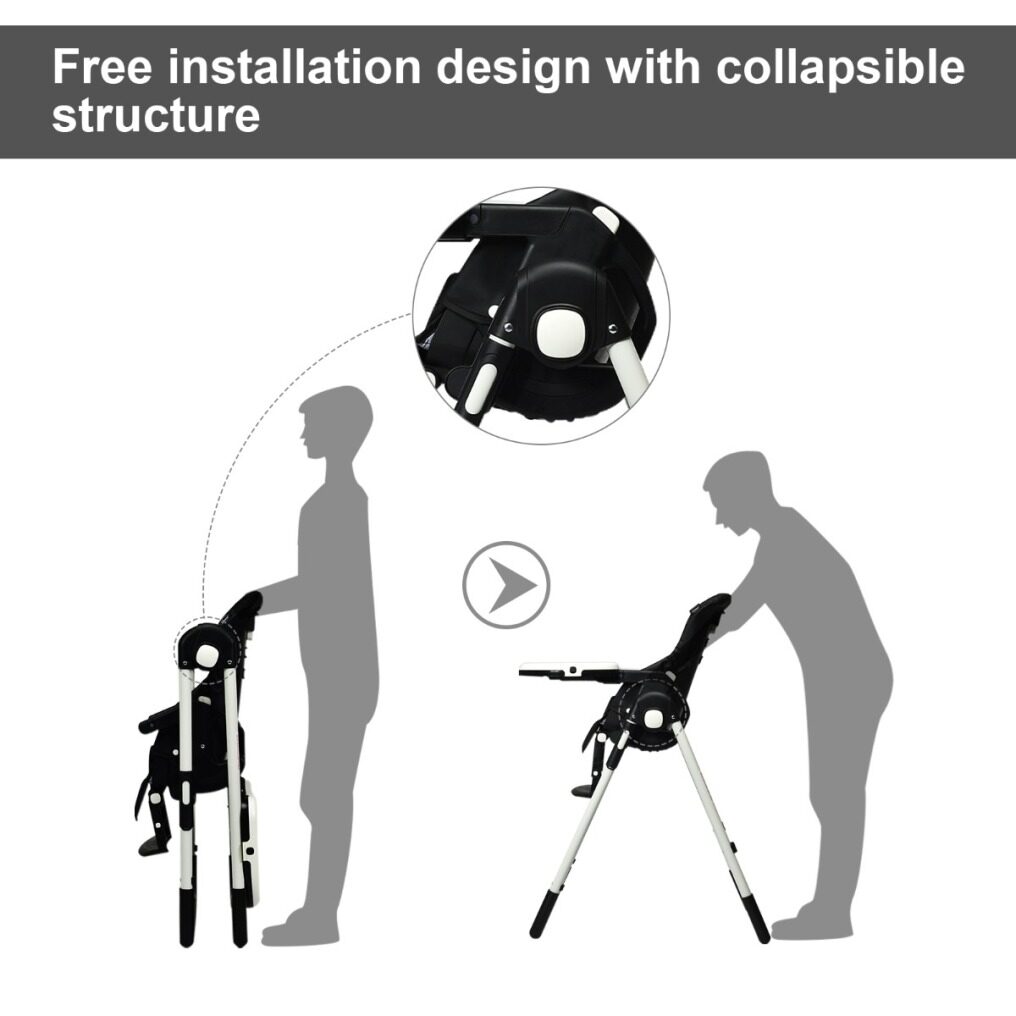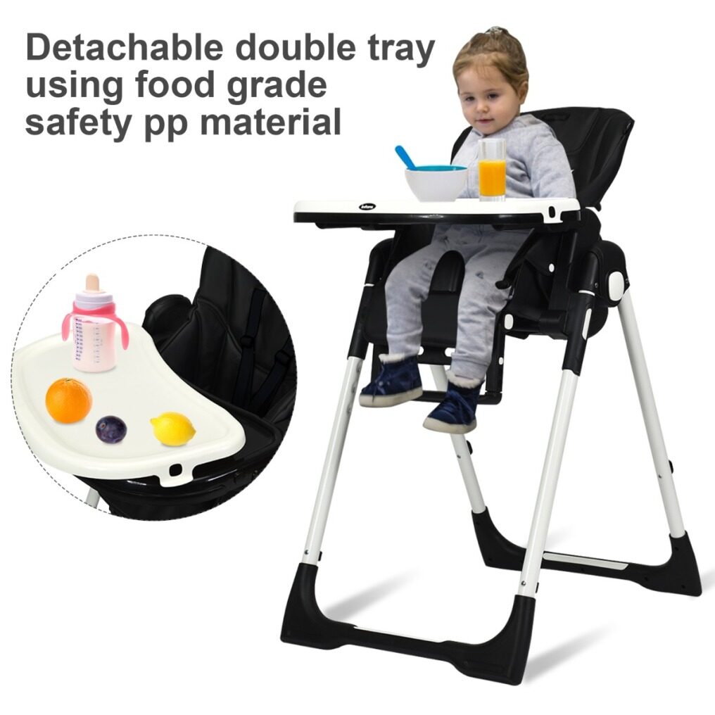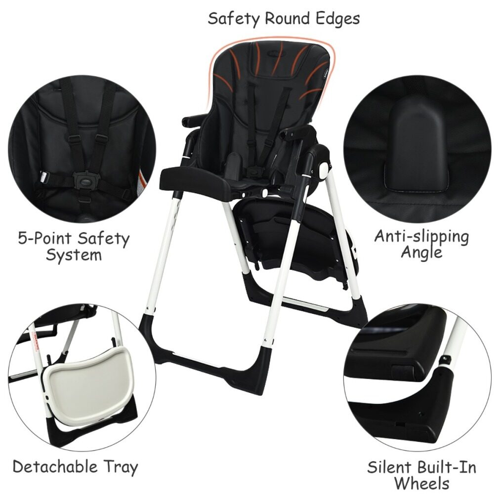 Easy To Clean With Detachable Design: Cleanliness has always been a top concern for baby products. Contact with detachable trays and seat cushions, this baby high chair is easy to clean and maintain after daily use. The removable PP top tray is also dishwasher safe. And the PU leather cushion is waterproof and you just need to wipe the smudges with a clean cloth. A 5-point safety harness ensures security for your little baby. All the corners of this baby highchair are smooth without sharp edges.