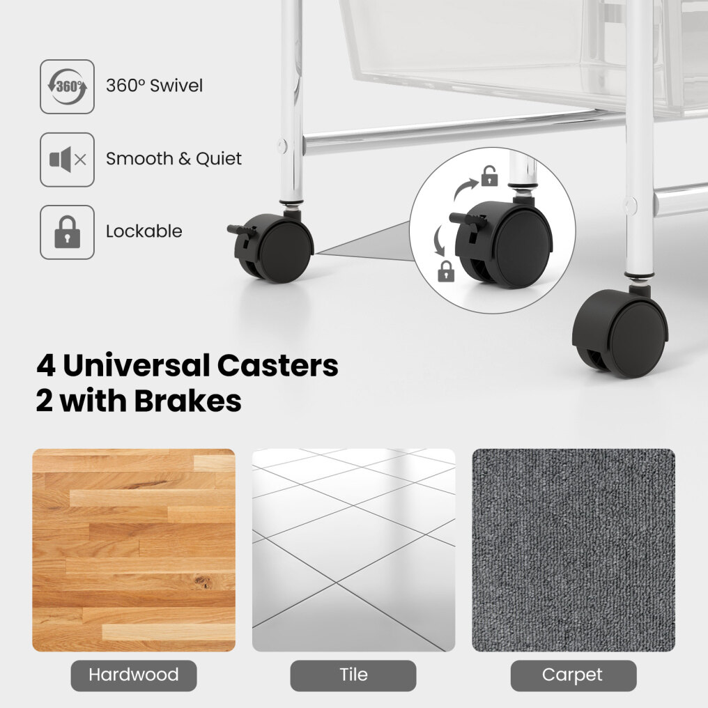● Flexible to Use and 2 Lockable Casters: The storage cart is equipped with 4 360°smooth-rolling casters for easy movement when you want to move it from room to room. And 2 of casters have brakes to lock the trolley in place for added stability.