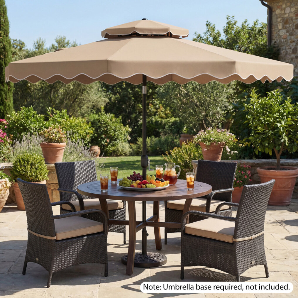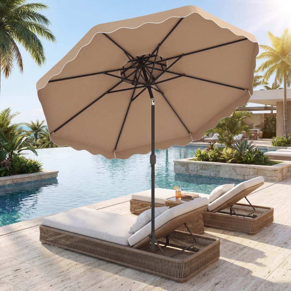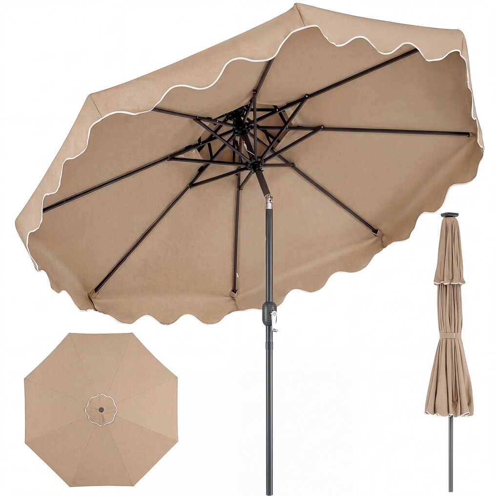 ● Shade Meets Elegance: The canopy of this outdoor umbrella is crafted from high-quality polyester fabric, for long-lasting performance, reliable sun protection, and drizzle resistance. Elegant ruffled edges and a scalloped valance bring a refined decorative touch, elevating everyday outdoor moments.