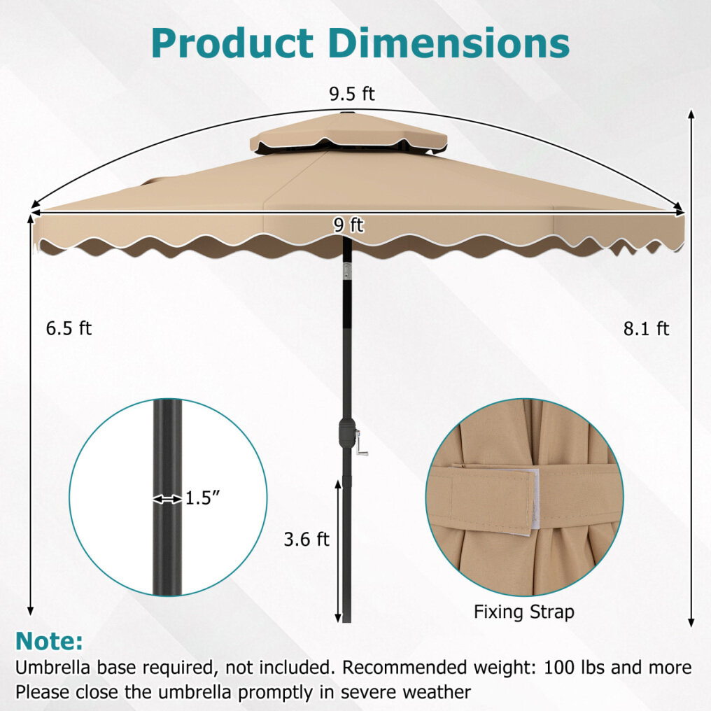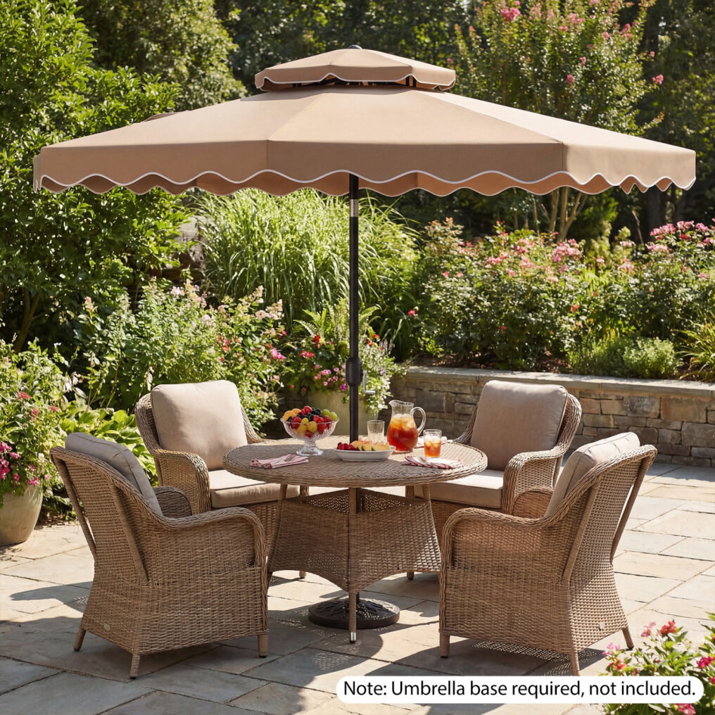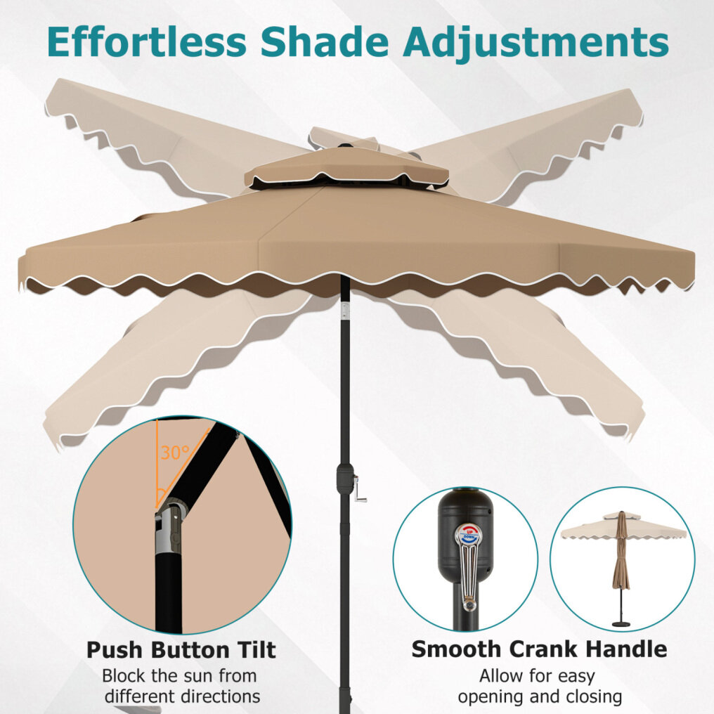 ● Shade Meets Elegance: The canopy of this outdoor umbrella is crafted from high-quality polyester fabric, for long-lasting performance, reliable sun protection, and drizzle resistance. Elegant ruffled edges and a scalloped valance bring a refined decorative touch, elevating everyday outdoor moments.