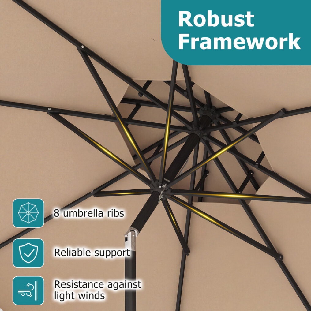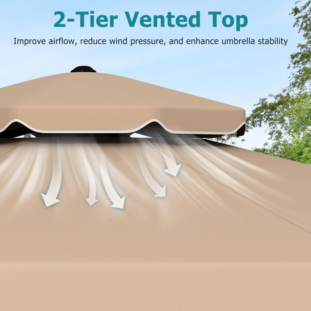 ● Breezy Stability Design: This 9 ft patio umbrella is built around a robust framework with 8 heavy-duty metal ribs that offer reliable support and added resistance against light winds. Plus, its 2-tier vented top improves airflow, reduces wind pressure, and enhances umbrella stability.