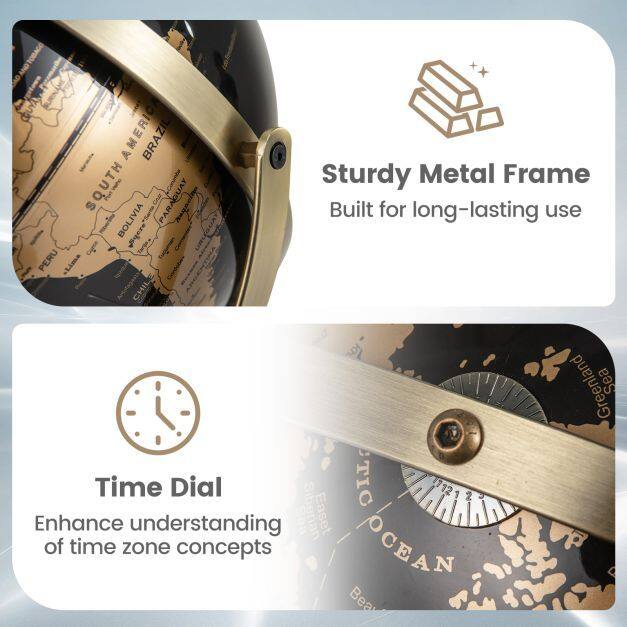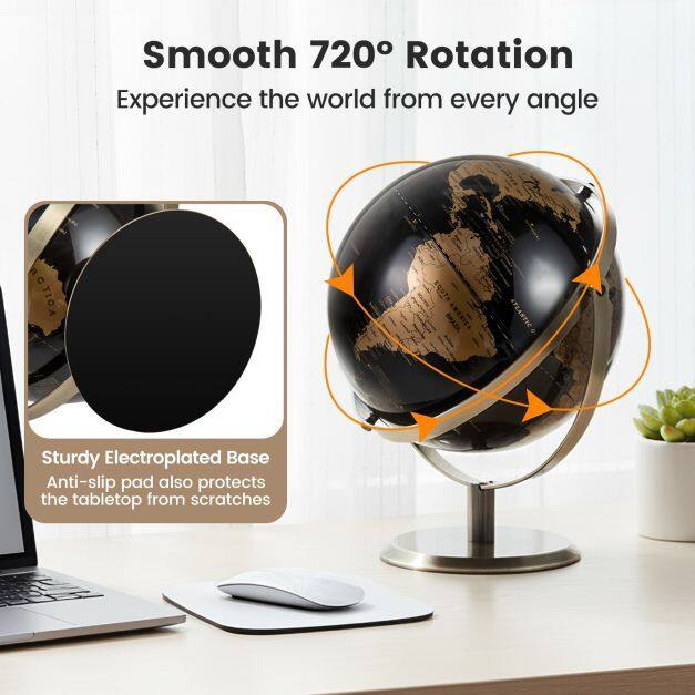 ● Robust Construction: Constructed with a sturdy metal frame, this world globe is built for long-lasting use. The sturdy electroplated base is equipped with a non-slip pad that prevents scratches and slipping.