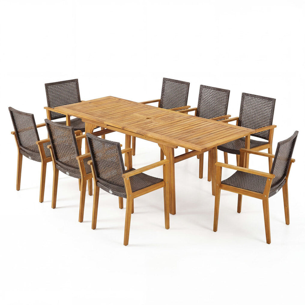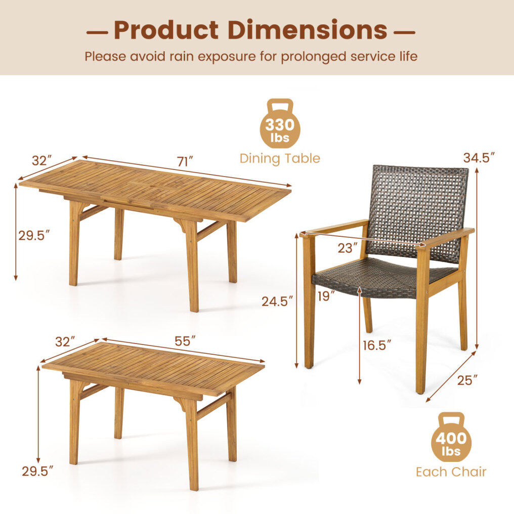 ● Premium Material Craftsmanship: The acacia wood table and chairs showcase a beautiful natural grain and a splinter-free surface. Selected high-quality wood forms the expandable table and chair frames. Mix-brown PE rattan seats offer breathable, sun-protective elegance for long-lasting use.