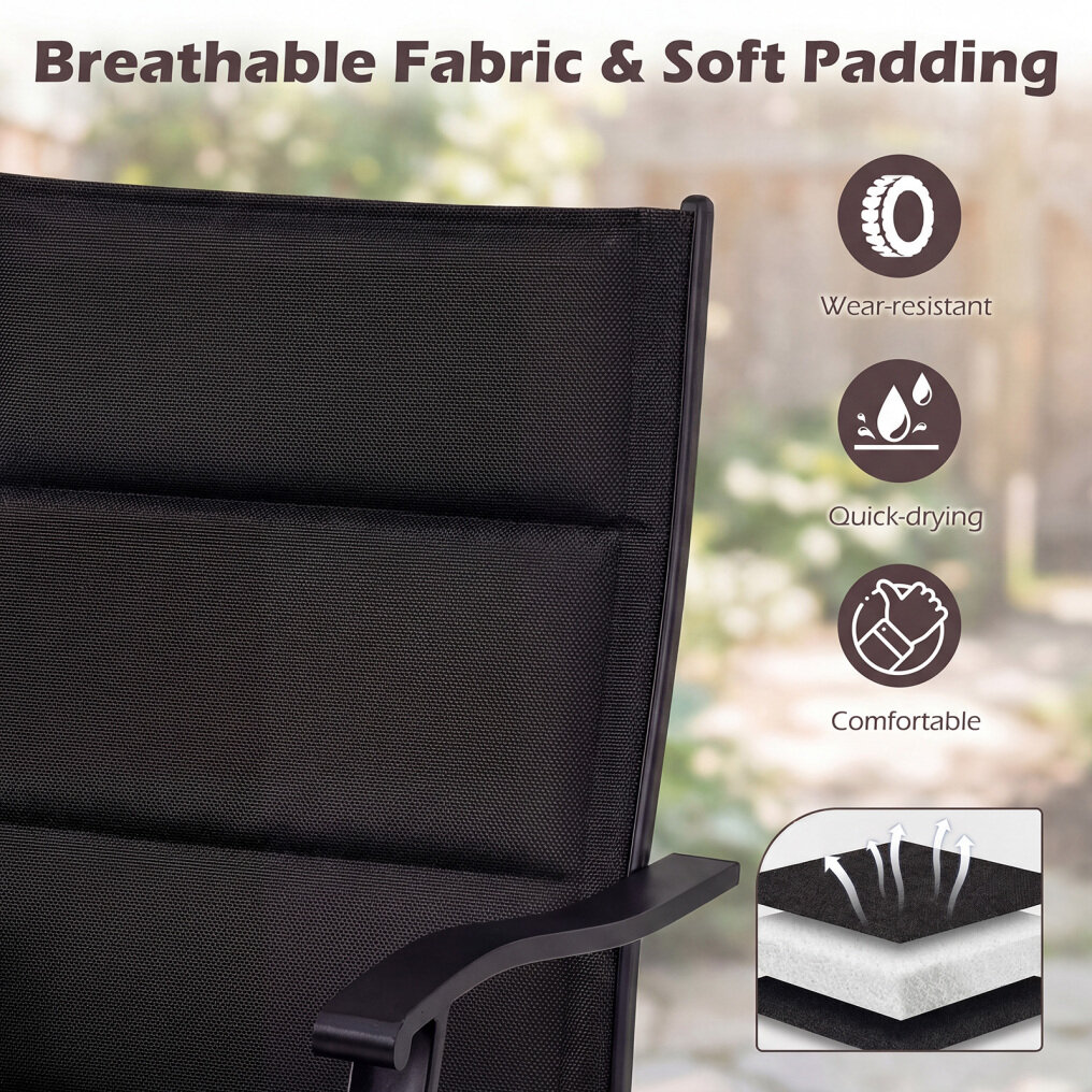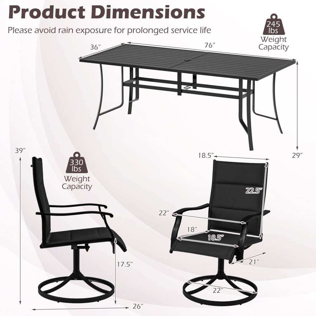 ● Sturdy Metal Construction: The patio furniture set is constructed with a robust metal frame, reinforced crossbars, firm connections and anti-slip foot pads. These features ensure that the set stands up well to everyday use, providing a reliable dining experience year after year. Please avoid rain exposure for prolonged service life.