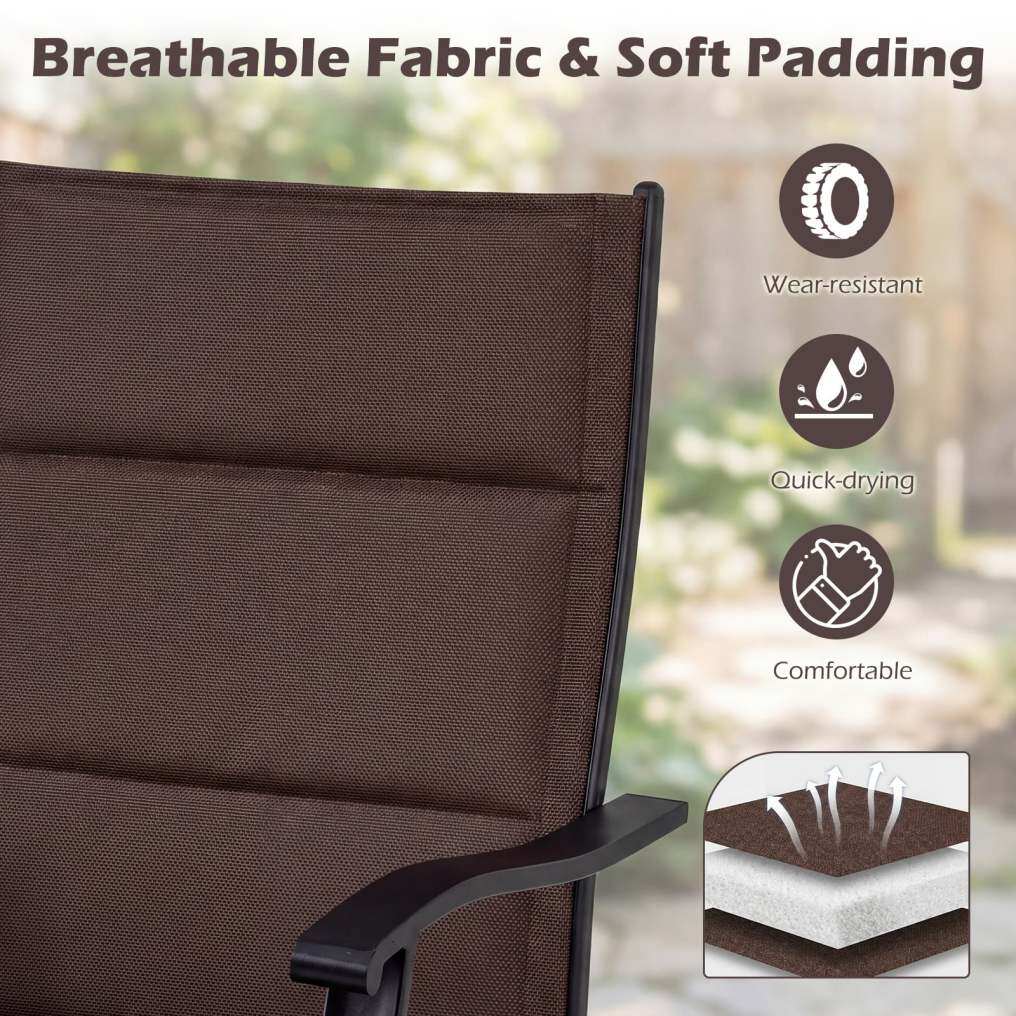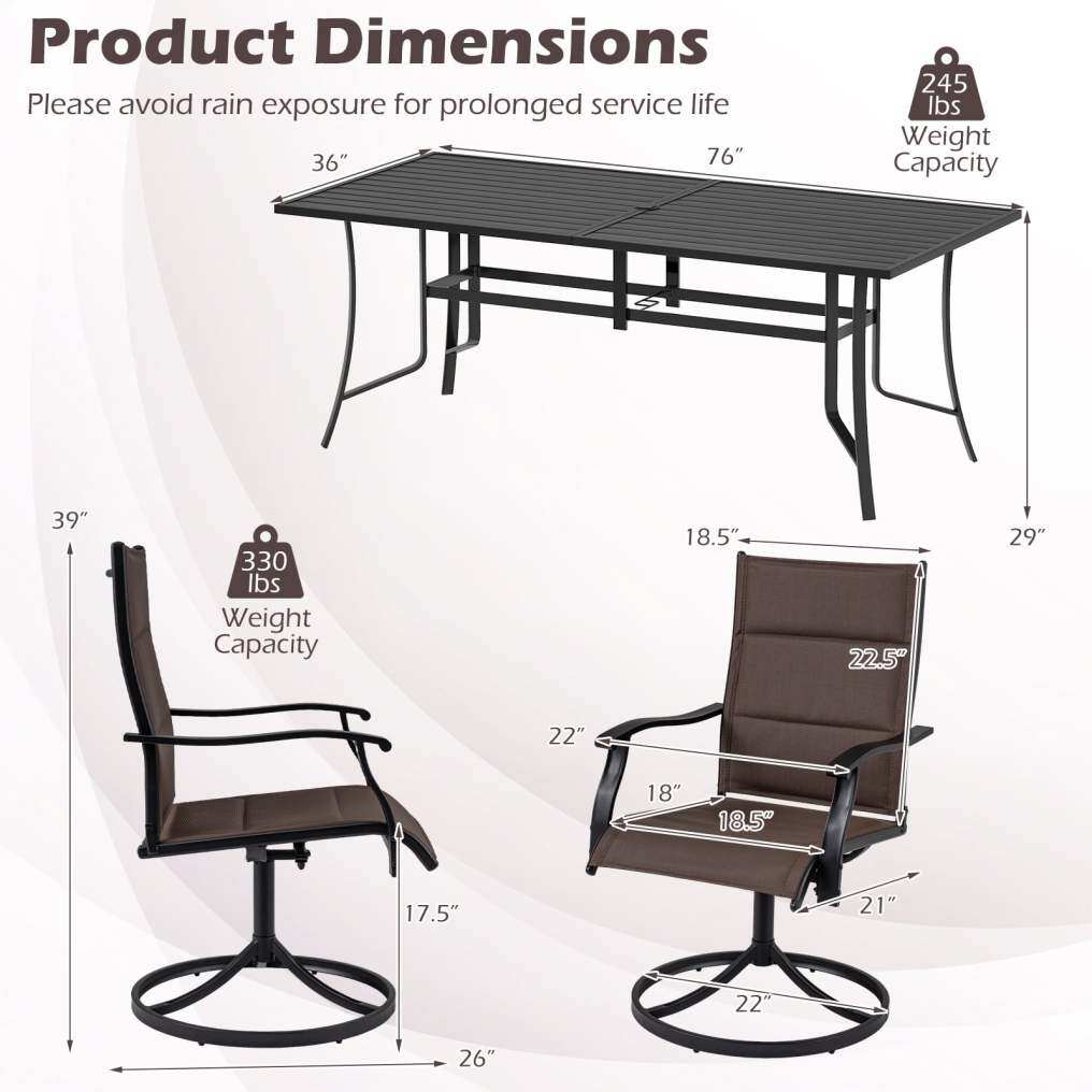 Sturdy Metal Construction: The patio furniture set is constructed with a robust metal frame, reinforced crossbars, firm connections and anti-slip foot pads. These features ensure that the set stands up well to everyday use, providing a reliable dining experience year after year. Please avoid rain exposure for prolonged service life.
