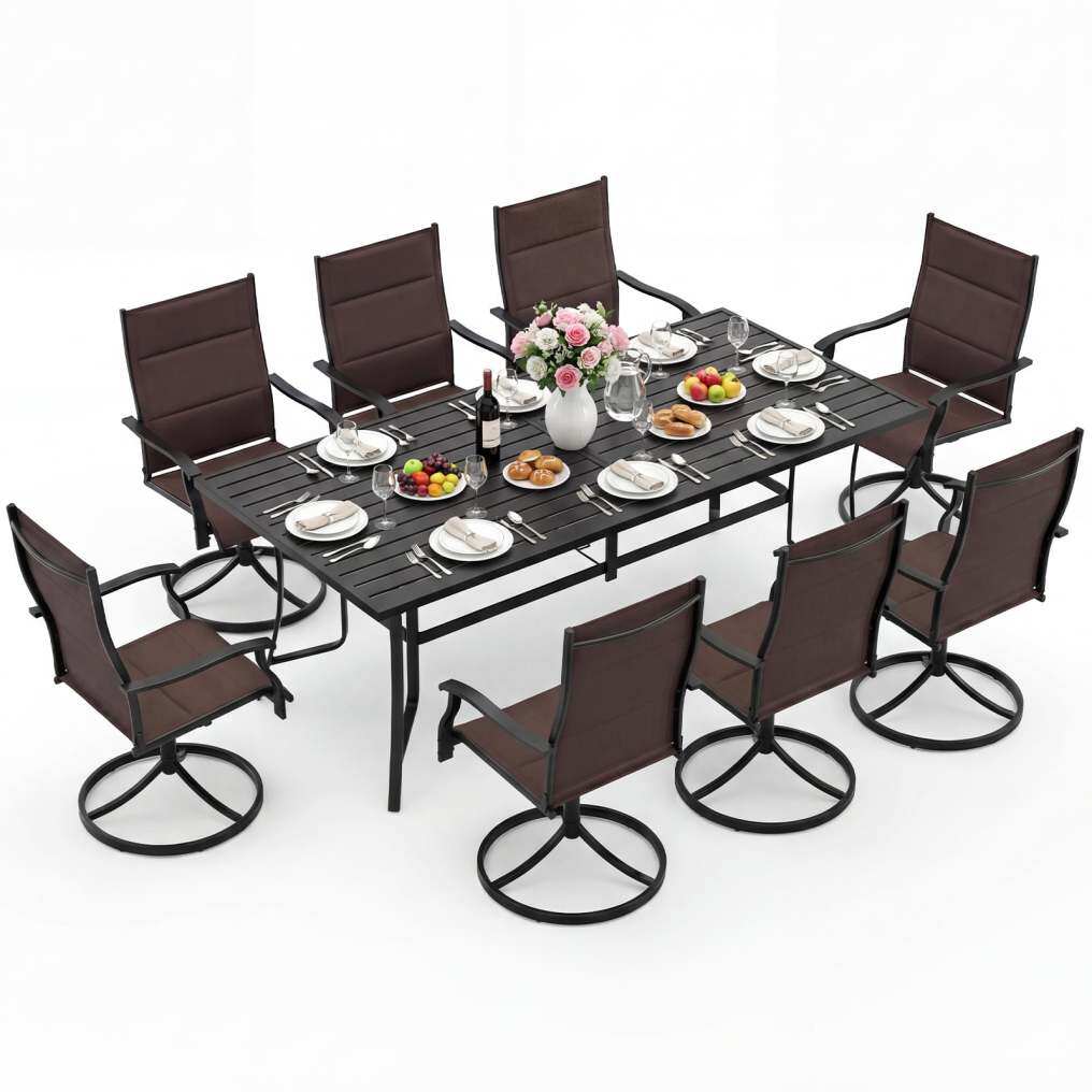 Outside Patio Table Set for 8: This outdoor dining set perfectly accommodates up to 8 people, making it an essential element for your family gatherings or friend parties. The 76” x 36” large tabletop offers ample space for dining, playing games or relaxing in a sizable group, ensuring interactions remain comfortable and engaging.