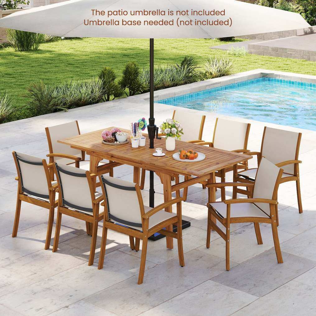 ● Complete 9-Piece Patio Set: This 9-piece outdoor furniture set includes 1 expandable table and 8 patio chairs, ideal for hosting vibrant outdoor gatherings in your patio, garden, deck, poolside or backyard. Please avoid rain exposure for prolonged service life.