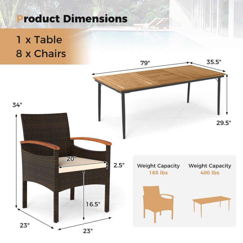 ● Spacious and Functional Design: The 79” x 35.5” rectangular table of this patio set offers ample dining space for your family and guests. Moreover, the 1.9” umbrella hole allows you to install your favorite umbrella (not included) conveniently. Note: Umbrella base needed (not included).
