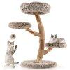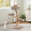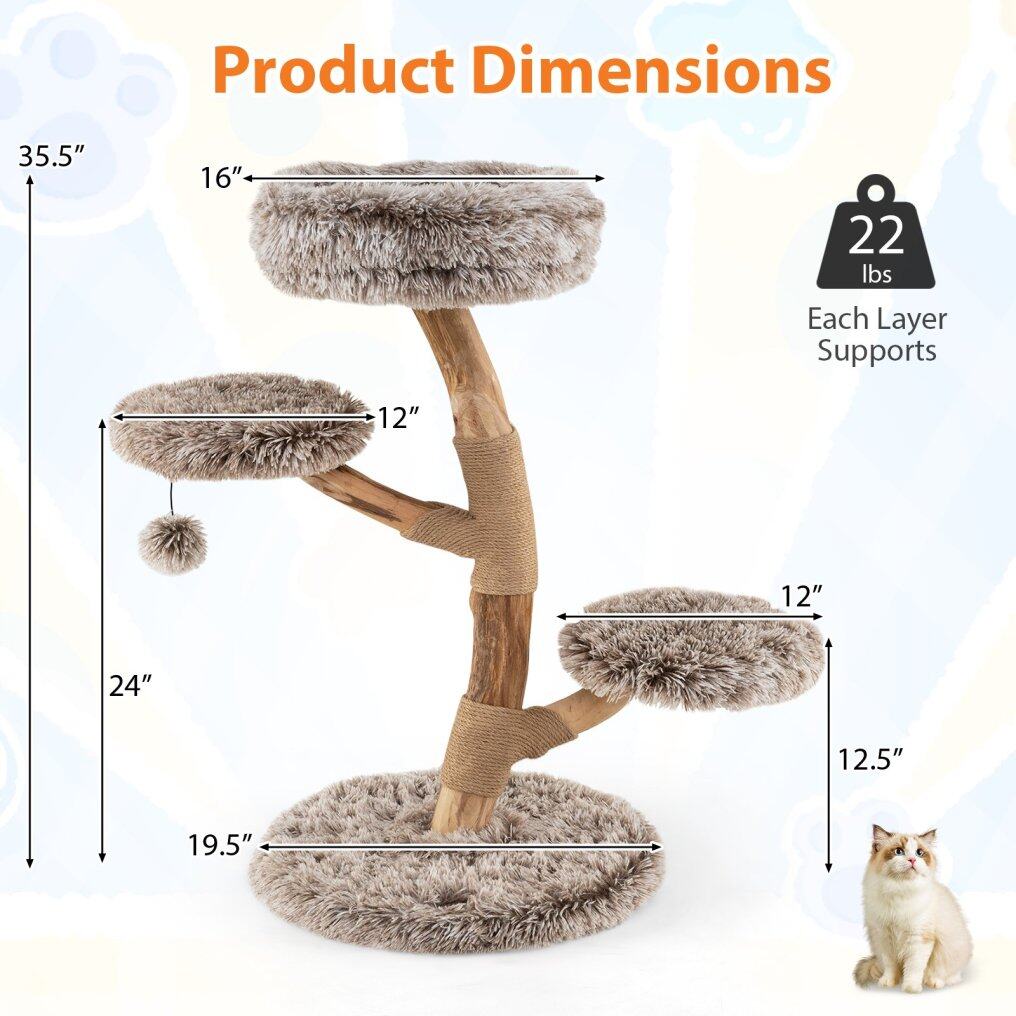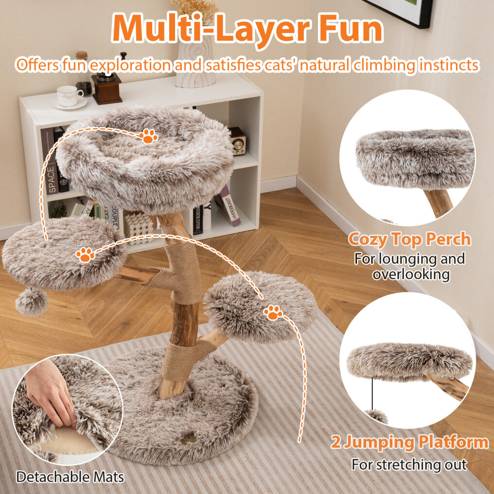 Not only does it offer a sturdy and unique structure due to its hard, reliable wood and uniquely beautiful natural grain, but it also provides a multi-layer playground designed to satisfy your cat's natural climbing instincts. With 4 levels of fun, including a cozy top perch and 2 jumping platforms, cats can explore and lounge in luxurious comfort. The soft long plush fabric covering the condo adds a layer of pampering, providing a soft and warm space ideal for naps or active play. For added amusement, this activity center features natural jute scratching posts and a playful swinging ball, catering to their scratching instincts while ensuring safety with a broad, thickened base and an anti-tipping device. This is not just a cat tree, it’s a vital piece of your home, promising safety, fun, and comfort for your beloved cats.