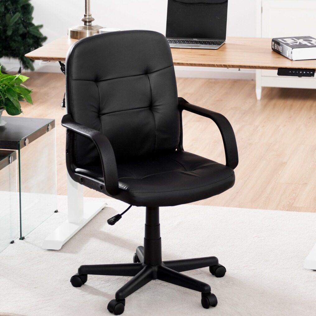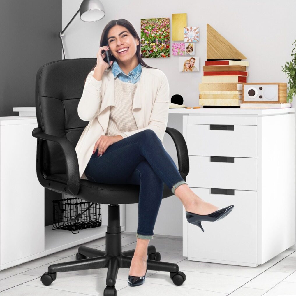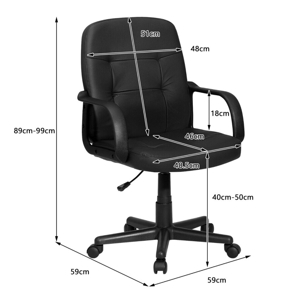 The ergonomic back design fits your body perfectly and relieves your fatigue of prolonged sitting. Soft cushion filled with high-density sponge offers you super comfort. Premium PVC surface is waterproof and durable, which is easy to clean. In addition, adjustable height (ranging from 89cm-99cm) and 360°swivel satisfy users’ different needs. The five carpet casters allow you to move the chair easily and effortlessly. Apart from that, modern appearance makes it suitable for home, office, reception center and internet cafe. It is easy to assemble. Don’t hesitate to buy it!
