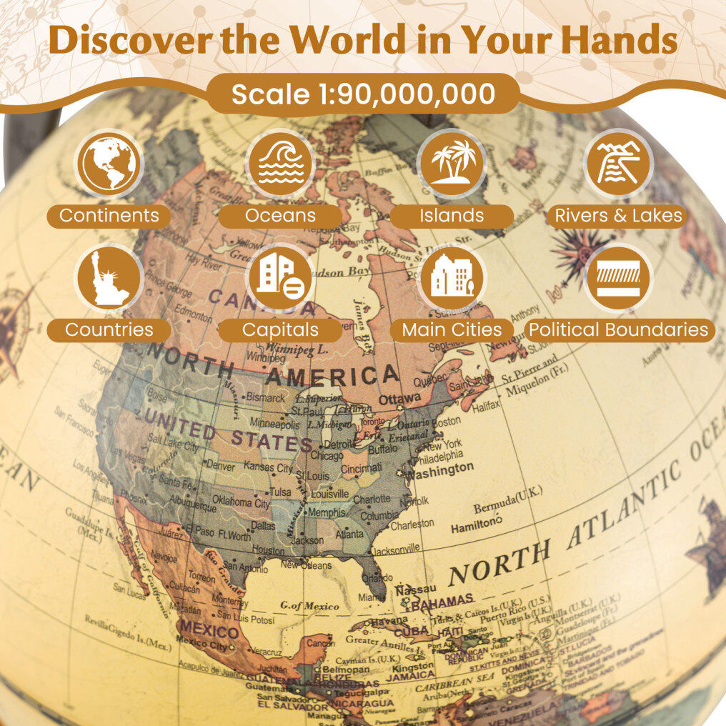 ● Elegant Wooden Base: Positioned on a classic wooden base equipped with an anti-slip pad, this vintage world globe combines traditional style with practicality. The base not only adds to the antique aesthetic but also provides stability and protects surfaces from scratches.