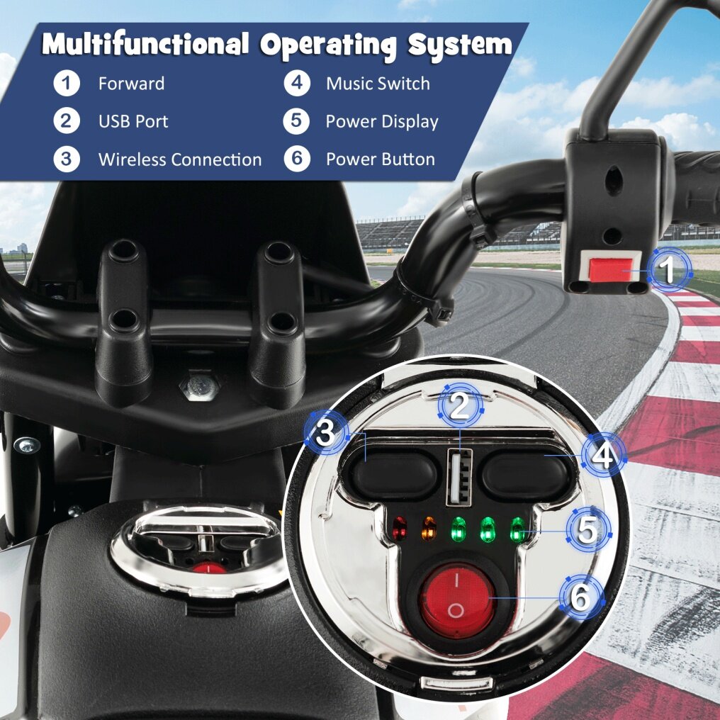 ● Cool and Fun Ride On Motorcycle: Cool mudguard, bright headlight and simulated exhaust pipe make this ride on toy look like a real motorcycle. Kids can press the power button and forward button to start or move it. Plus, there are different music to choose. It also has USB port and wireless function for more music options.