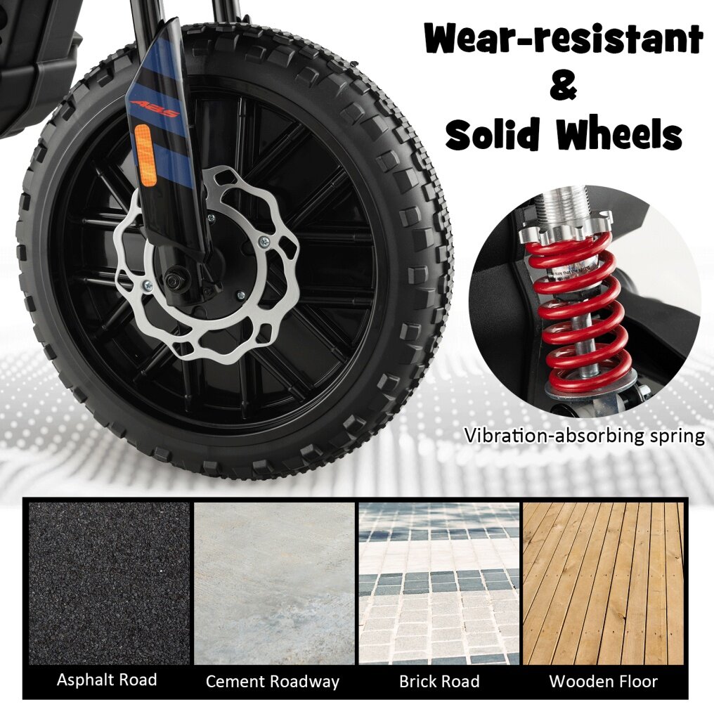 ● Dual Motors for High Performance: Equipped with dual powerful motors, this Aprilia licensed motorcycle can reach 3.4-3.7 mph speed, offering your little one an exciting driving experience. Besides, powered by 12V 7AH battery, this motorbike ensures 1-2 hours play time.