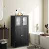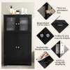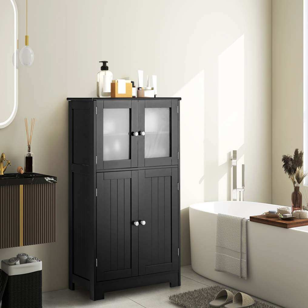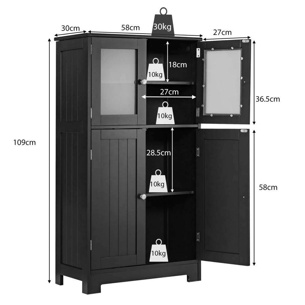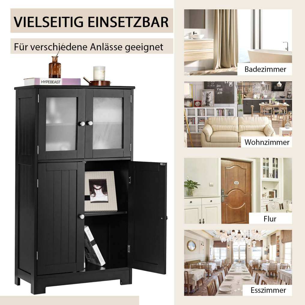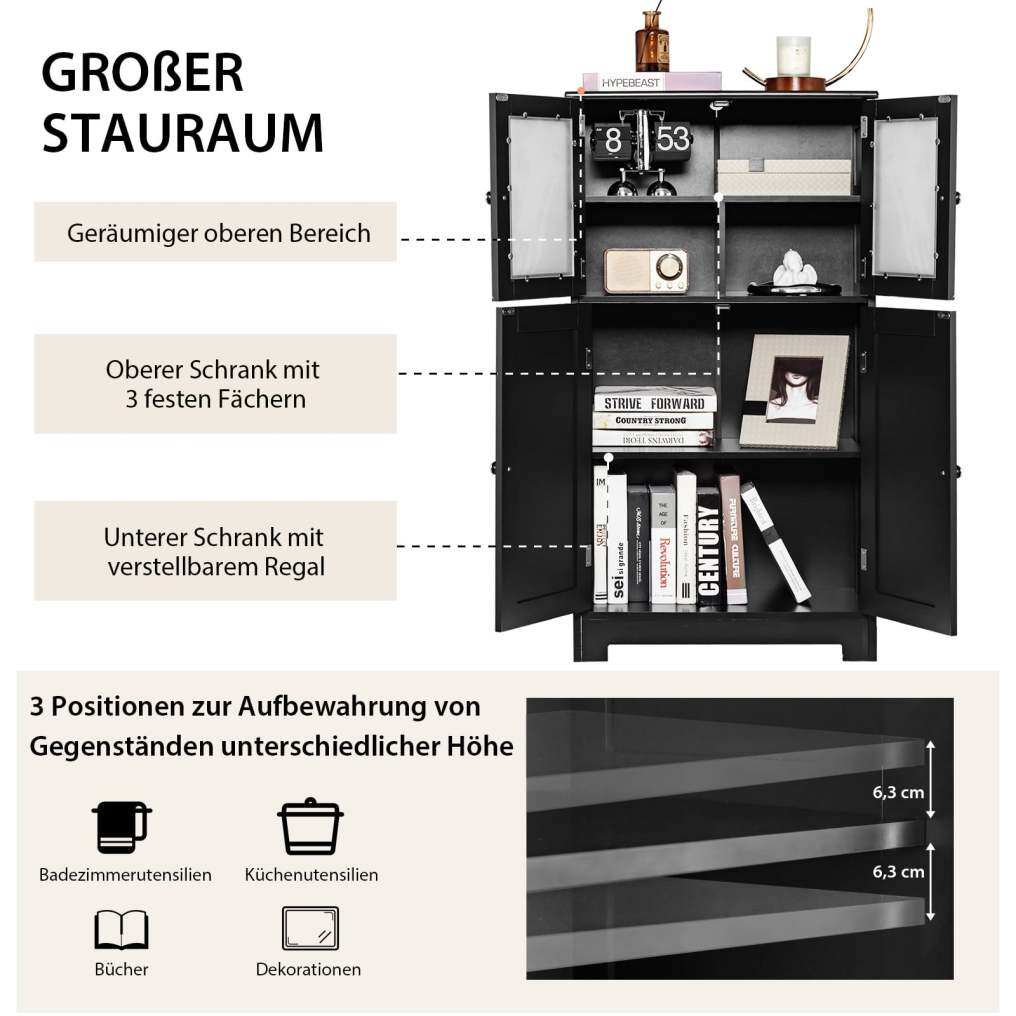 Keep things organized: This 4-door cabinet offers plenty of space for a variety of items, from toiletries and books to spices and other belongings. One of the shelves is adjustable to three different positions, accommodating even larger items.