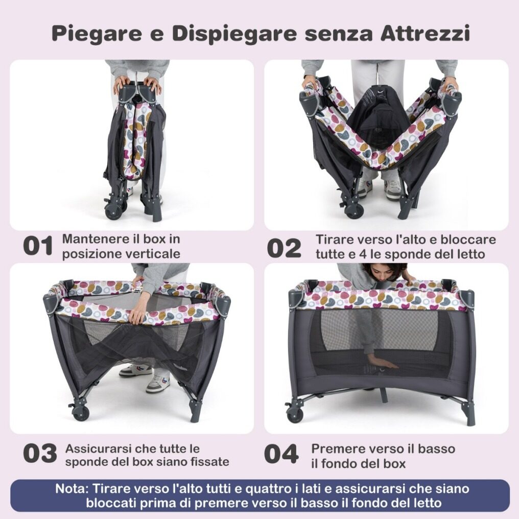 Tool-Free Folding: ① Hold the playpen upright. ② Lift and lock the 4 sides of the crib. ③ Make sure all sides are locked. ④ Press down on the bottom of the playpen. Note: Lift all four sides and make sure they are locked before pressing down on the bottom of the crib.