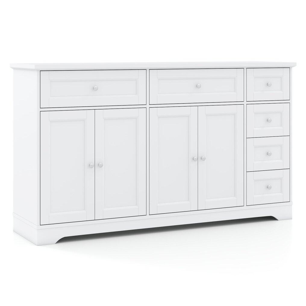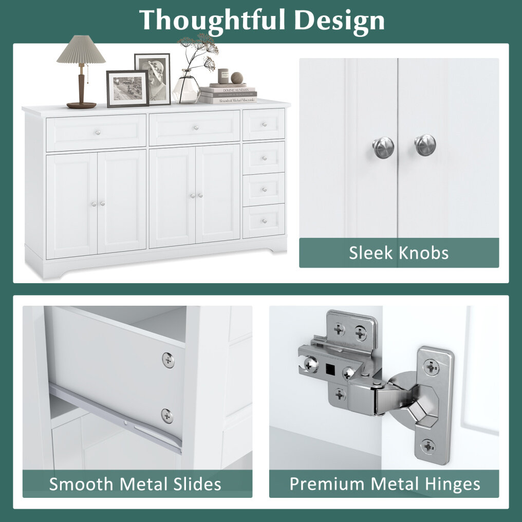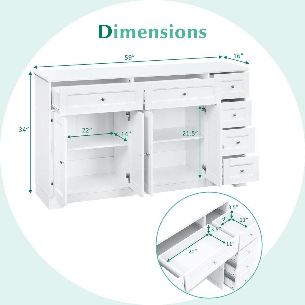 ● Generous and Adjustable Storage: The buffet sideboard stretches 59" wide and pairs 6 smooth-glide drawers with 2 roomy cabinets whose shelves can be repositioned at 3 heights, so your dinnerware, linens, or small appliances always fit perfectly.