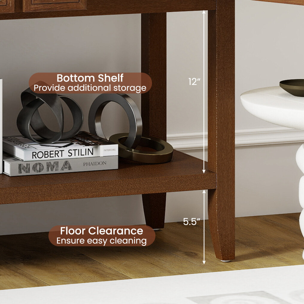 ● Vintage Appeal: This sofa table with doors combines vintage charm and contemporary efficiency with its clean lines and rustic knobs, adding a touch of timeless elegance to your living area.