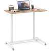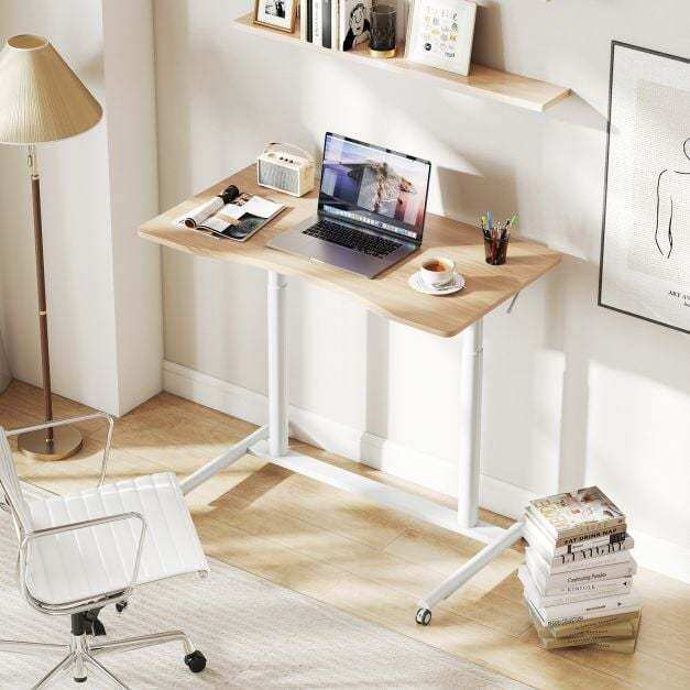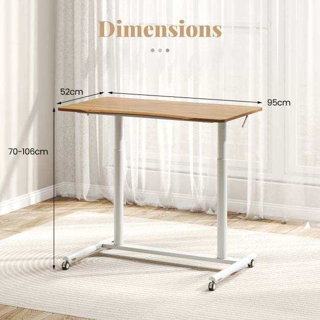 Enjoy the seamless sit-stand work style with the sit stand desk, crafted for easy transitions between sitting and standing with an adjustable height range of 70 to 106 cm. The reliable gas spring ensures smooth height adjustment. Its enduring, robust construction, including aluminum tubes and an H-shaped metal base, can securely hold up to 90 kg. Mobility is effortless with 4 universal wheels, which are lockable as well for secure stopping. The desktop is user-friendly with rounded corners and an anti-crash design, ensuring a spacious and ergonomic workspace. Ideal for any room in your home, the space-efficient C-shaped design maximizes your area, making it perfect for various settings.