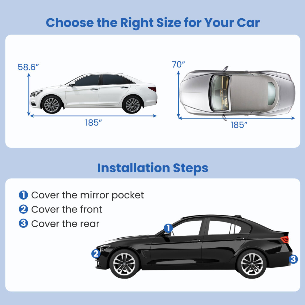 This all-season cover shields your vehicle from snow, rain, sun, leaves, bird droppings, and dirt, ensuring year-round protection. Tailored for sedans up to 470 cm, it boasts mirror pockets, reflective strips, elastic bands, and windproof buckles for a snug, secure fit. It also comes with a handy storage bag for easy storage and portability. More user-friendly details await your discovery. Compatible Model: Toyota Corolla, Honda Civic. If your car model isn’t in the table, please choose the matching car length and make sure it’s a sedan.