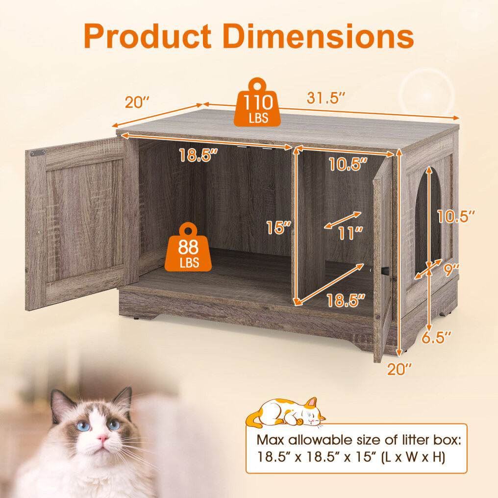 Important Size Notice: The wooden cat house measures 31.5" x 20" x 20" (L x W x H) and fits litter boxes up to 18.5" x 18.5" x 15" (L x W x H). Please measure your current litter box before purchase to ensure a proper fit and optimal comfort for your pet.