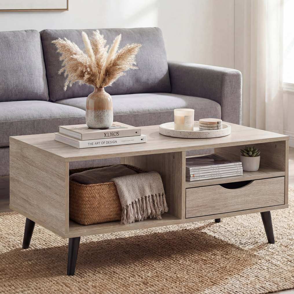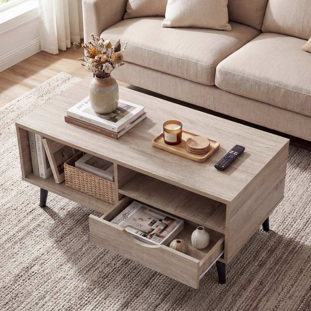 ● Premium Details: Discover thoughtful craftsmanship with sleek cutout handles that provide easy access to the drawer, paired with metal slides for smooth operation. The rectangle coffee table comes with a splinter-free surface for easy maintenance.