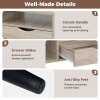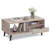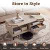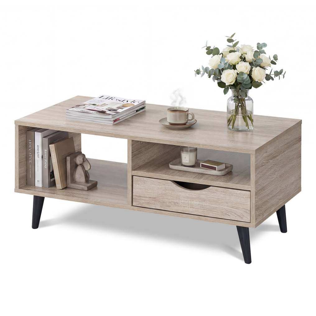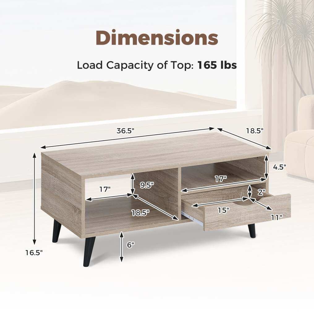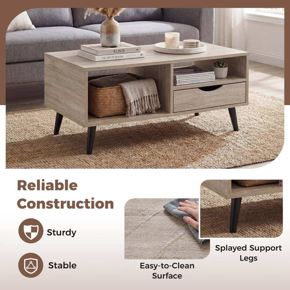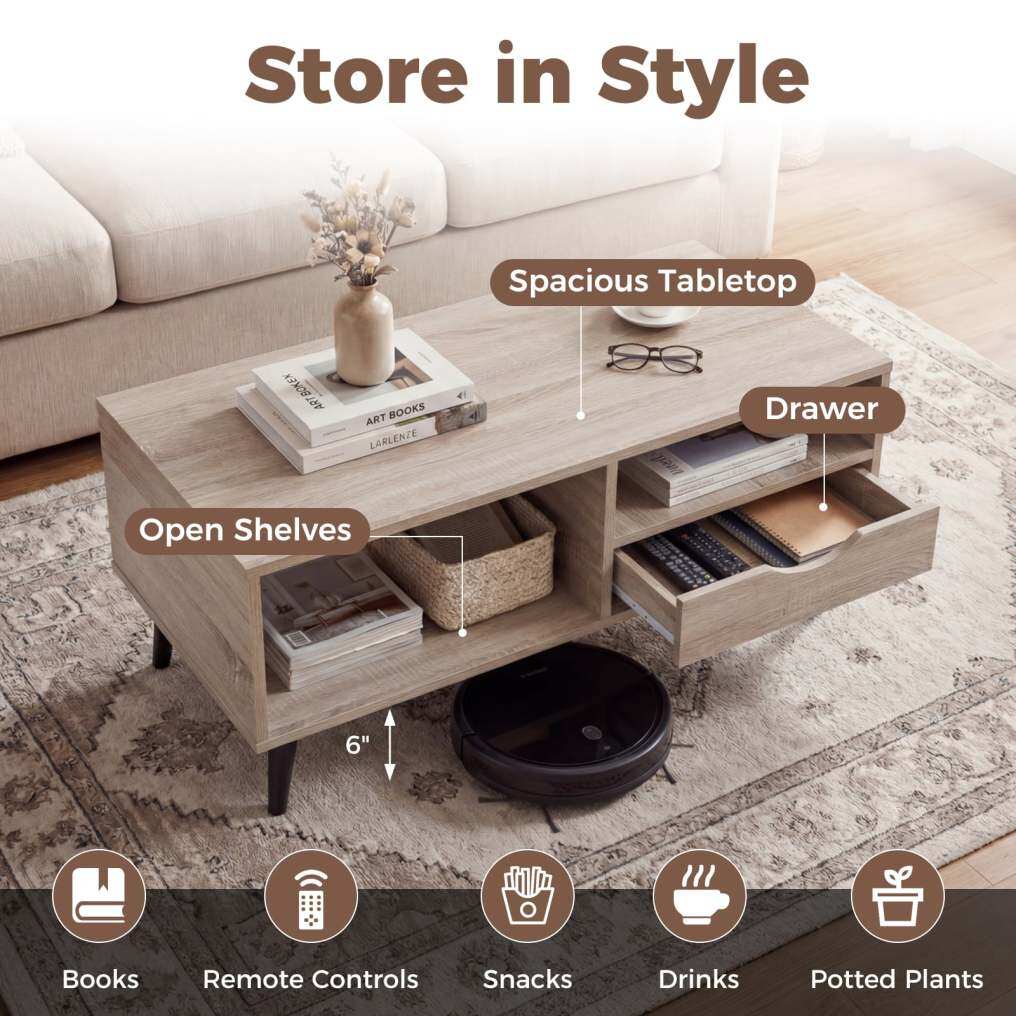 ● Stylish Storage Solution: The coffee table features a spacious tabletop, open shelves, and convenient drawer, offering ample room for books, remote controls, snacks, drinks, potted plants, and more.