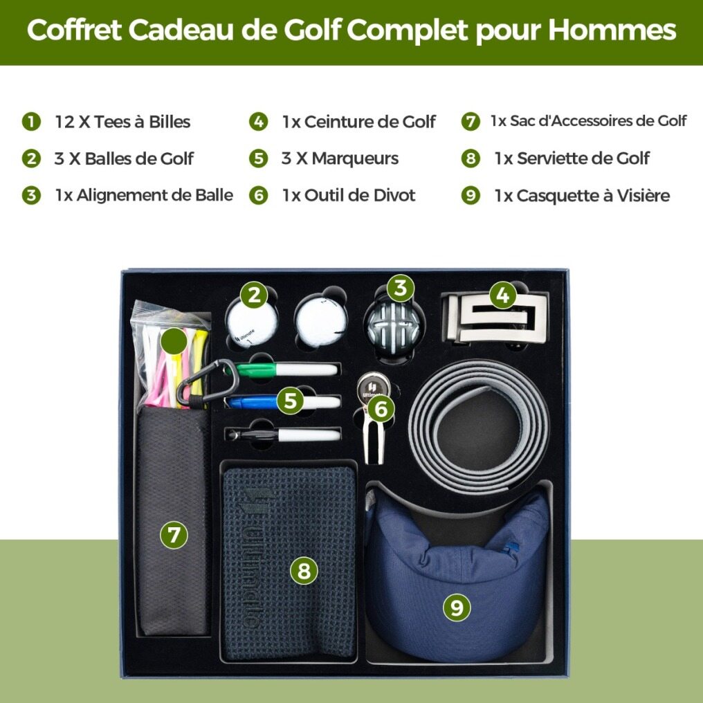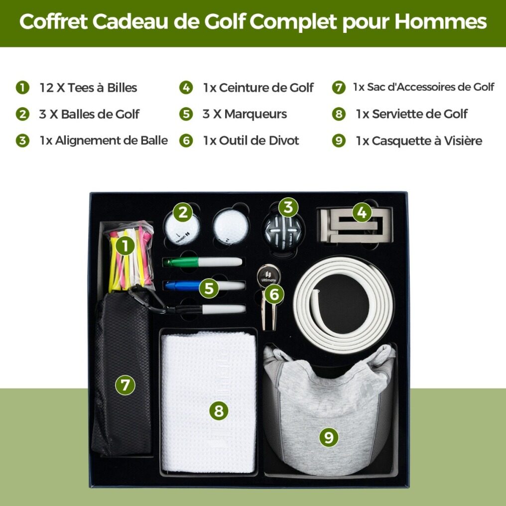 Whether you're a seasoned player or just starting out, this all-inclusive golf accessories set offers key essentials that enhance golfing experience. It features 3 standard golf balls and 12 sturdy golf tees, providing reliable performance. The golf towel with carabiner allows you to easily attach it to your bag for quick access. For style and comfort, the set includes a high-quality 2-layer cowhide belt and a lightweight hat with SPF 35 protection. The golf ball line marker tool and the divot tool with a removable ball marker help enhance your golfing precision while ensuring easy repair on the greens. What's more, the golf gift box comes with a storage bag to keep golfing gear organized and accessible.