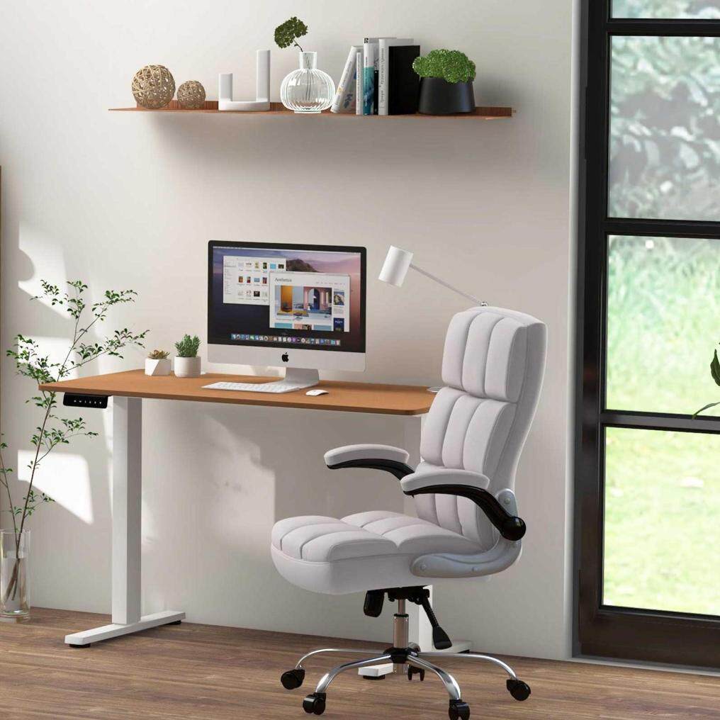Executive Chair for Comfort & Posture Support: The high-back executive chair is upholstered in soft linen fabric, offering lumbar support and cushioning that conforms to your body. Designed to reduce fatigue during long work sessions, it supports good posture whether at sitting height or when paired with the standing desk.