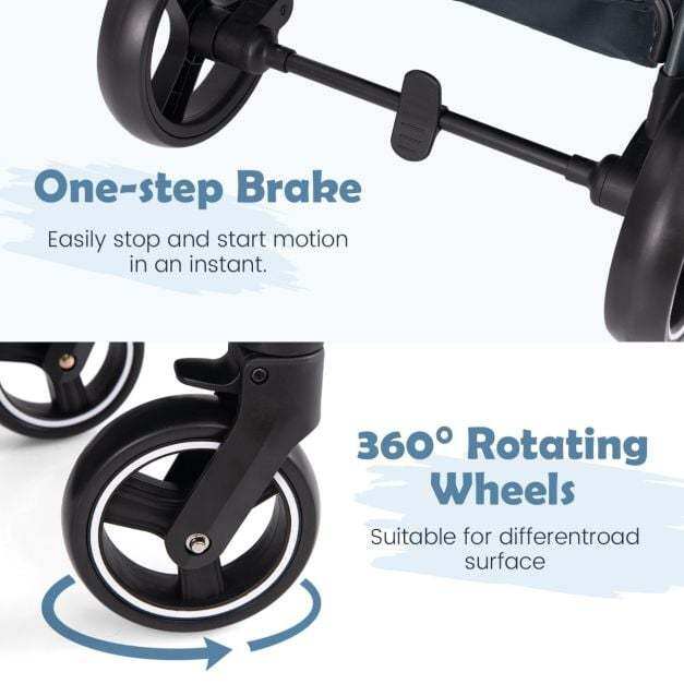 The rotating seat allows you to switch between forward-facing and parent-facing positions to keep your child engaged or comforted. The stroller features an adjustable backrest, canopy, detachable footmuff, and safety rail for a comfortable, secure ride. Outings are made easy with a 5-point safety harness, spacious storage basket, peek-a-boo window for quick check-ins, and a bottle holder for added organization. Shock-absorbing front wheels rotate smoothly for easy maneuvering, while rear wheels with a brake offer secure stops on various terrains. The foldable design makes storage and transport simple, catering to busy families on the move.