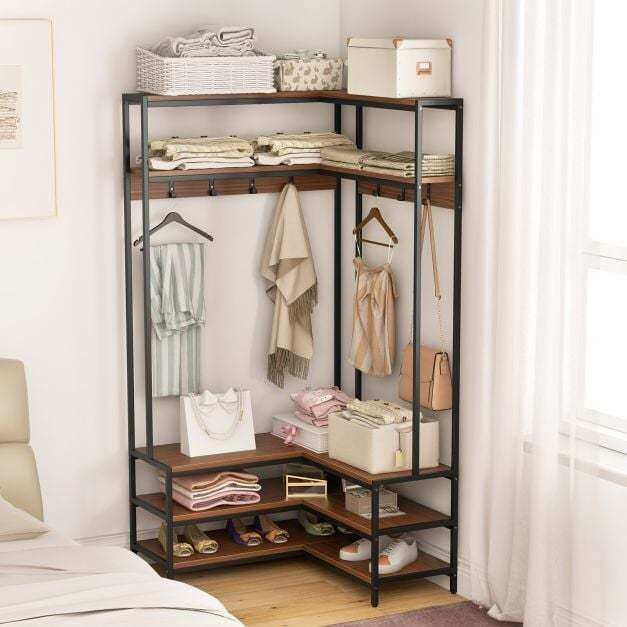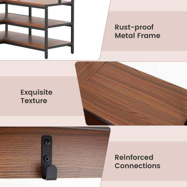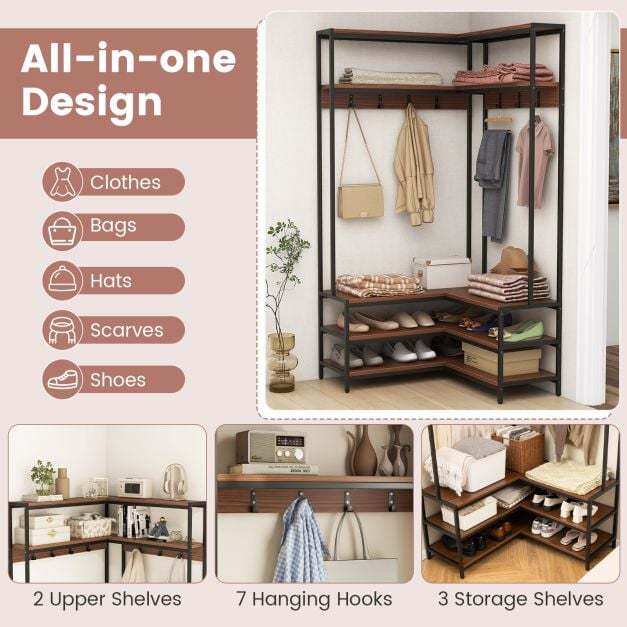 -2 upper shelves, 3 storage shelves, and 7 hanging hooks for ample storage space