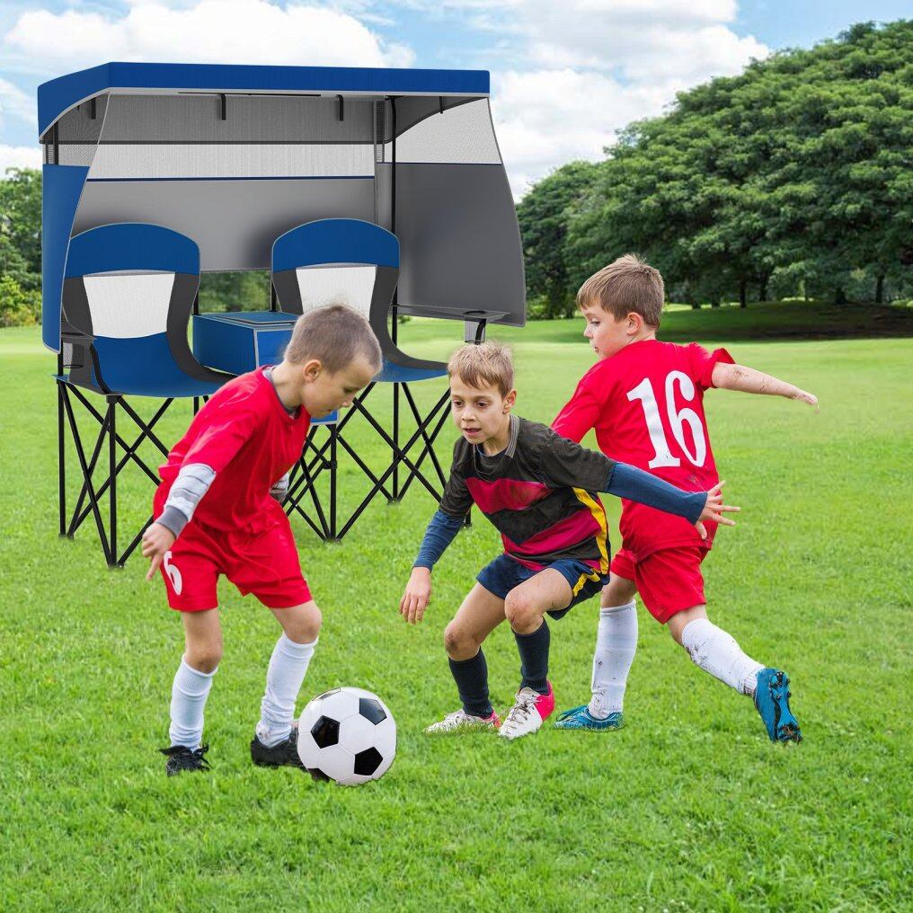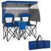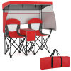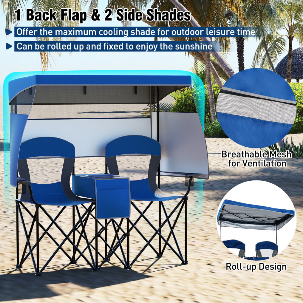 This double beach chair measures 163 x 72 x 153 cm (L x W x H) and comes with 2 spacious seats, ideal for enjoying outdoor leisure time with your beloved one. Moreover, it folds effortlessly and includes a portable carrying bag for convenient storage and transportation, thus you can easily carry it anywhere you want, from beaches to campsites and even sporting events. Designed to offer superior sun protection, our camping chair features a UPF50+ silver-coated canopy that can be adjusted to shield you from the sun's rays, complete with 2 side shades and a back flap for additional coverage. 3 shading curtains can be rolled up, while the canopy is detachable, meeting different needs. For enhanced reliability and stability, the chair is supported by a robust metal frame and crafted from a thickened oxford seat, complete with large footpads, preventing sliding or sinking into the soft ground. Added features such as the middle cooler bag keep your refreshments cold, while the integrated cup and phone holders ensure your essentials are always within easy reach.