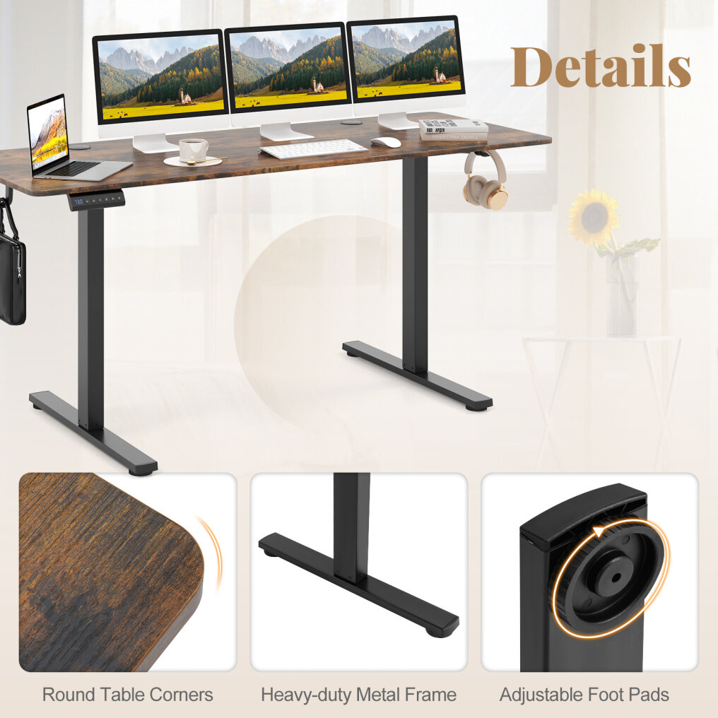 Electric Standing Desk with 3 Memory Heights and 2 Hanging Hooks and Cable Holes-Rustic Brown