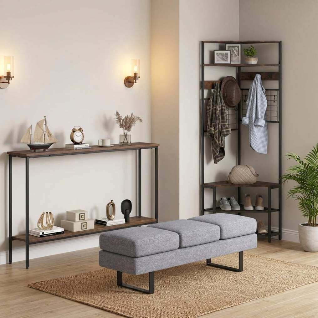 • All-in-One Entryway Solution: Combines an 8" wide 2-tier console table, a corner-mounted coat rack (2-tier shoe rack + 12 hooks), and a 3-person waiting chair to cover entryway storage, seating, and organization needs in one cohesive set.
