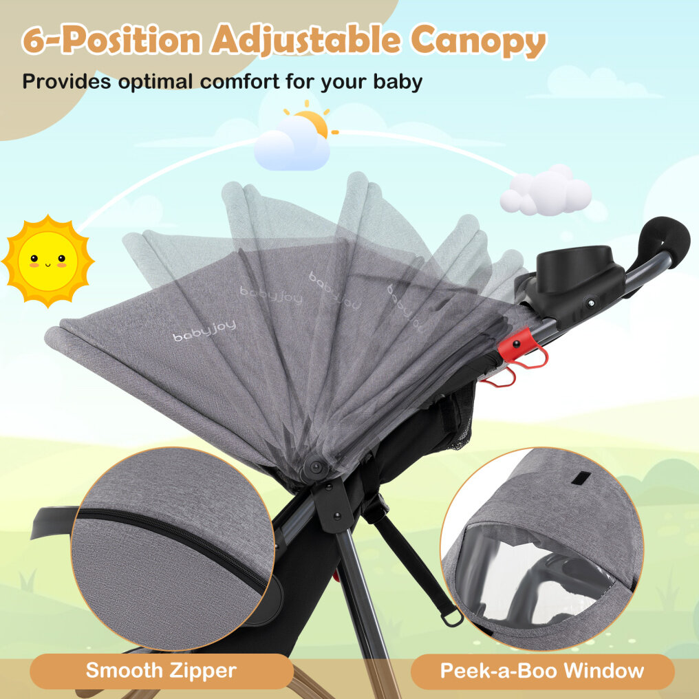 ● Adjustable Canopy and Seat: Complete with a smooth zipper and peek-a-boo window, the canopy can be set to 6 positions to suit your baby’s desire to either explore the surroundings or enjoy a restful nap. The seat reclines from 110° to 143°, providing maximum comfort throughout your outings.