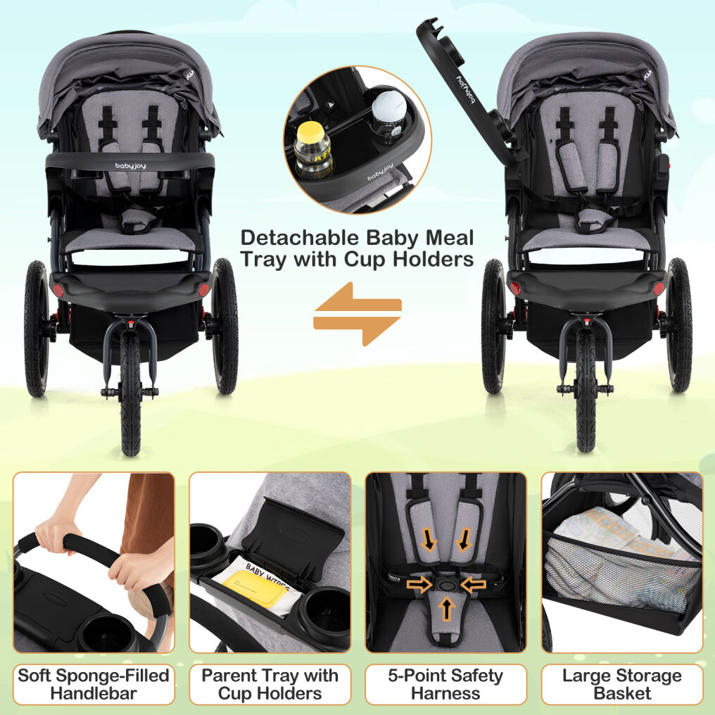 ● Friendly to Parents and Babies: Designed with both parent and child in mind, the jogger stroller includes dual trays, cup holders, a large storage bag, and a cushioned sponge handlebar. These thoughtful additions offer convenience and ease during your strolling adventures.