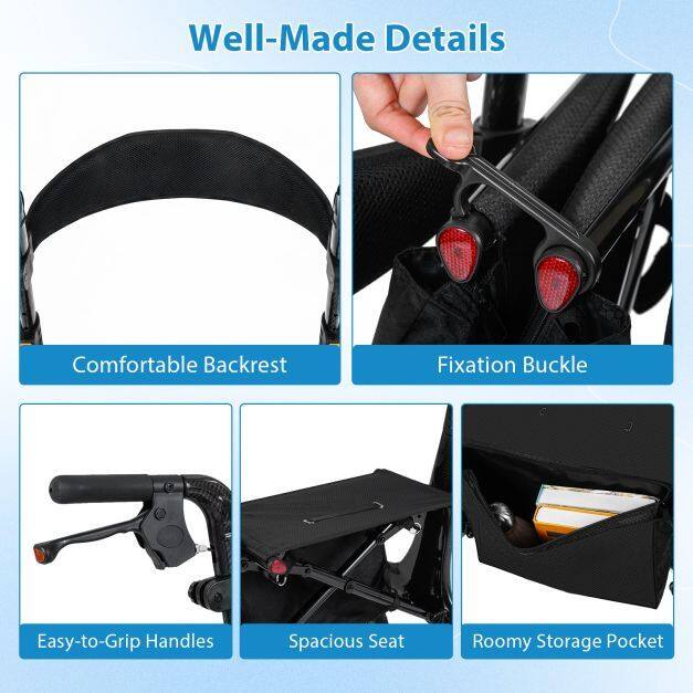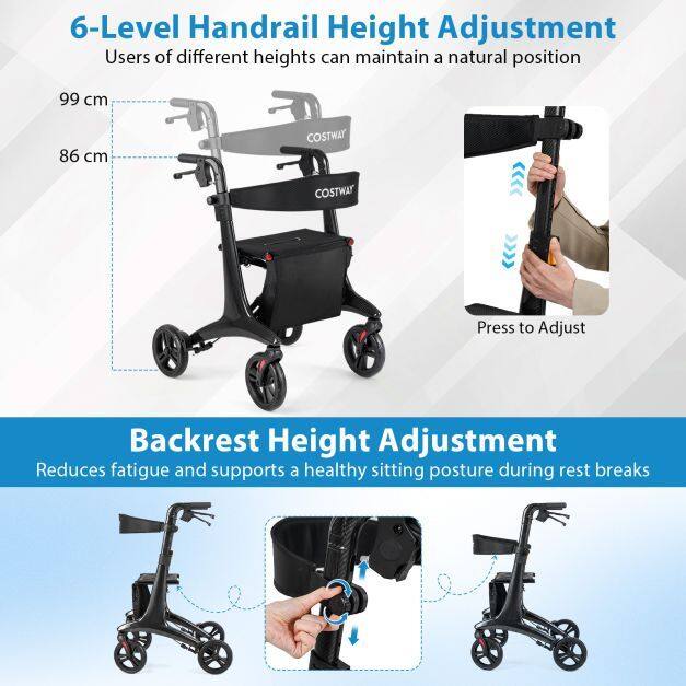 ● Personalized Comfort: The rolling walker features 6-level height adjustable handles ranging from 34" to 39" ensuring the ergonomic support for users of varying heights. In addition, the adjustable backrest provides customized relaxation, and the spacious seat lets you rest comfortably whenever needed.