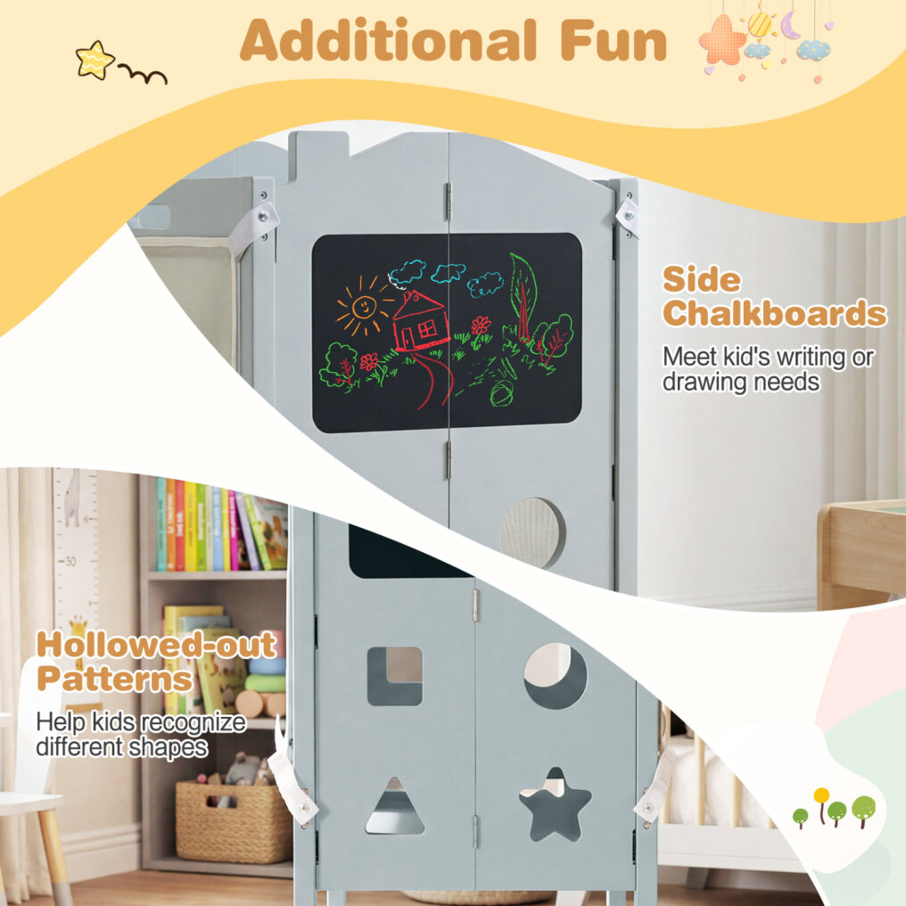 ● Chalkboards and Lovely Patterns: The small chalkboards on both sides meet kid's writing or drawing needs, which is great for kid's creativity, imagination, and motor skills. Moreover, the hollowed-out patterns help kids recognize different shapes and create a playful look.