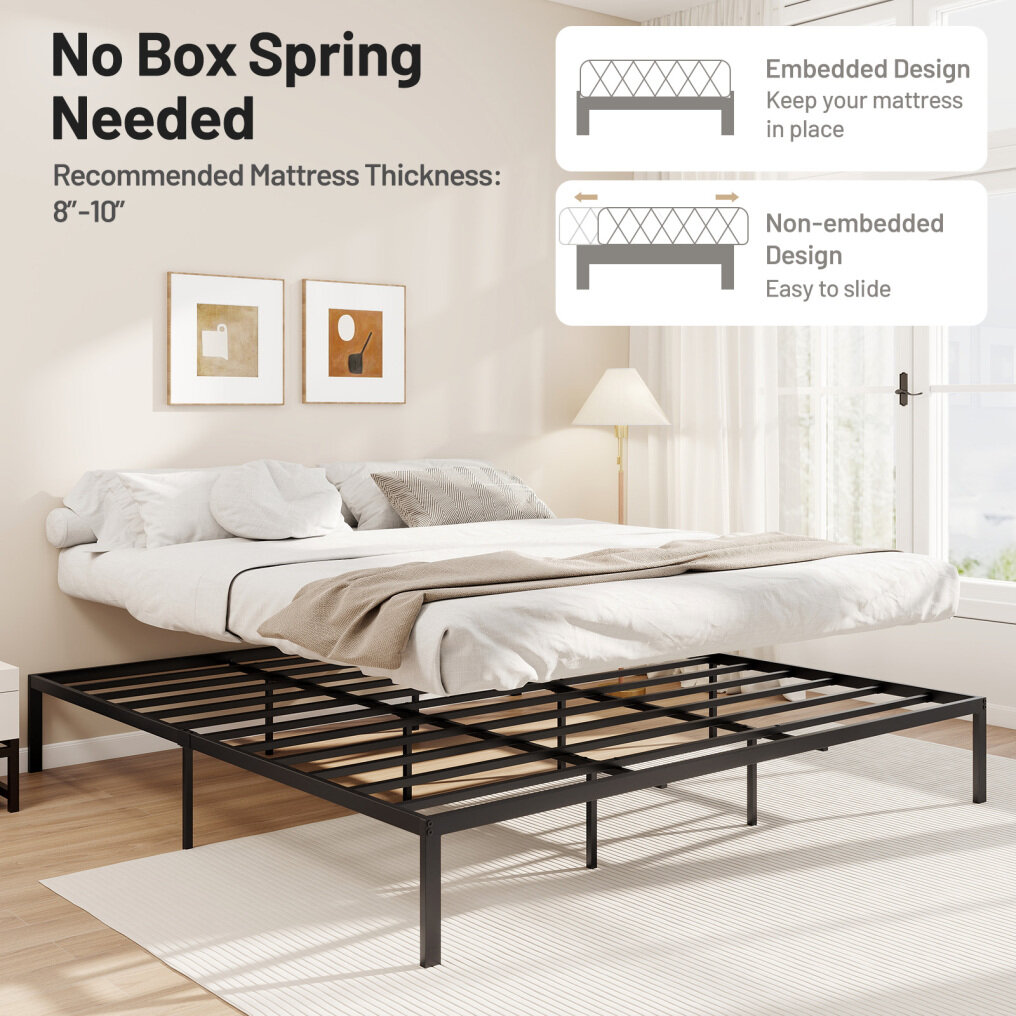 ● Robust Metal Construction: Constructed of heavy-duty metal frame with reinforced connection, the full/queen/king size bed can sustain up to 660 lbs/660 lbs/880 lbs. Moreover, 11 thick metal slats and 5/5/8 strong support legs make the bed frame more stable.