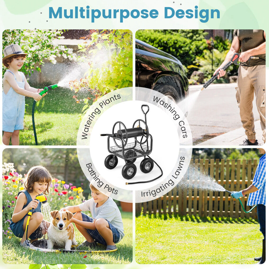 ● Multipurpose Design: There includes a bottom storage basket to keep gardening tools within reach. Whether you're watering plants, irrigating lawn, washing cars, or bathing pets, this reel cart is an ideal helper, making your outdoor tasks a breeze.
