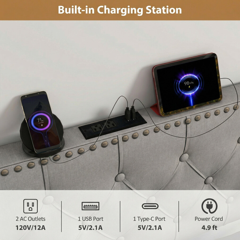 ● bedroom headboard includes 2 AC outlets, as well as USB and Type-C ports. This versatile feature allows you to charge multiple devices simultaneously.