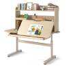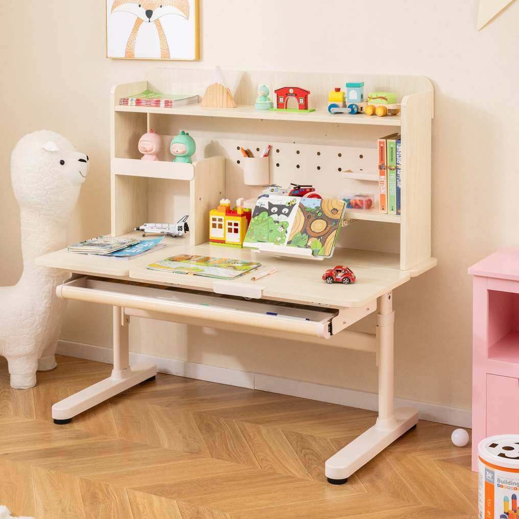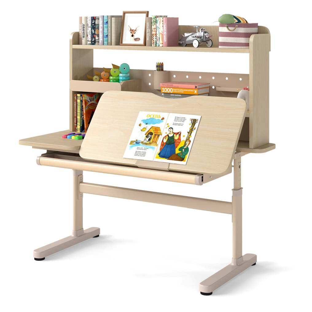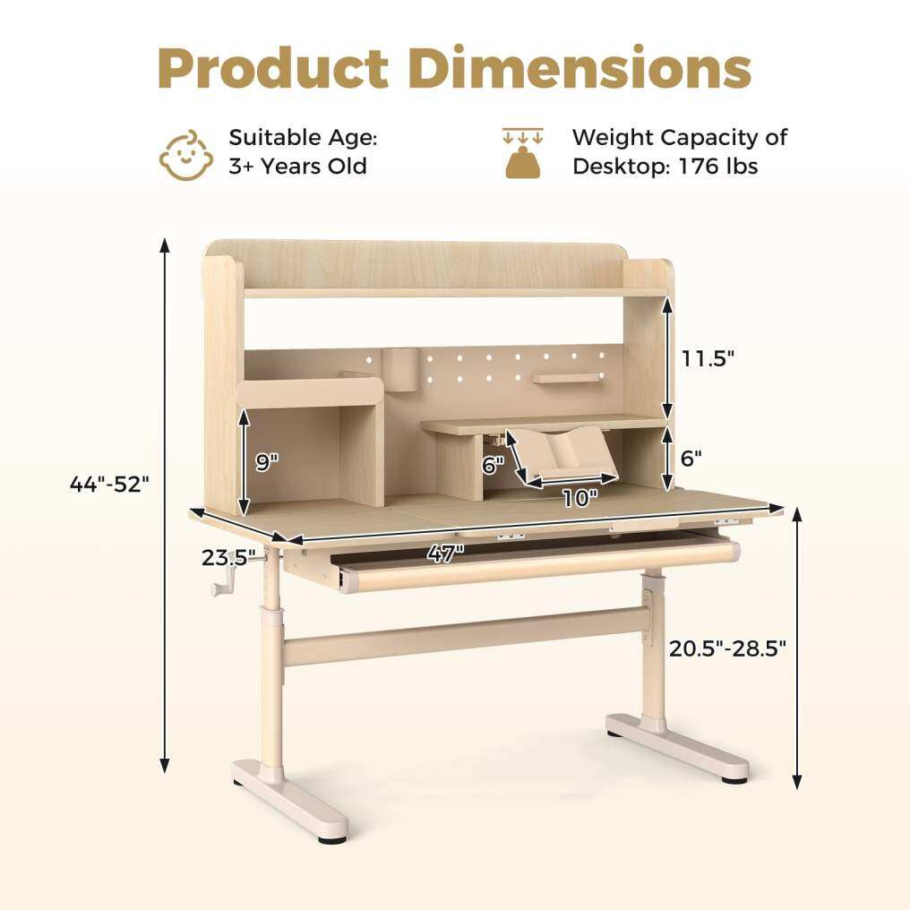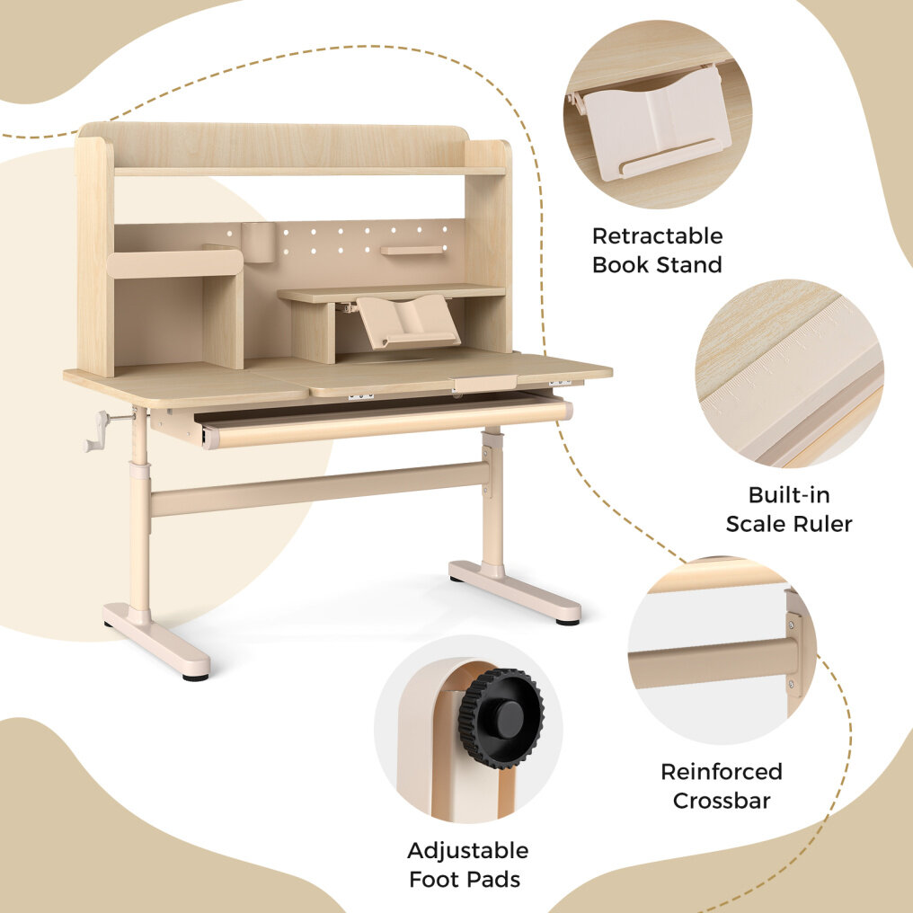 Thanks to the hand-cranking system, you can adjust the height according to kid's height. The desktop can tilt up to 60 degrees, making it comfortable for kids to study, read, or draw. To keep essential supplies organized, the writing table is designed with the top shelf, pen holder, tray, partition drawer, and bookshelves. Moreover, the retractable book stand can be used for supporting open textbooks or tablets. The built-in scale ruler allows kids to easily measure. The robust widened legs and adjustable foot pads keep the table steady and stable. Furthermore, the reinforced crossbar enhances the overall strength. The rounded corners ensure safe use.