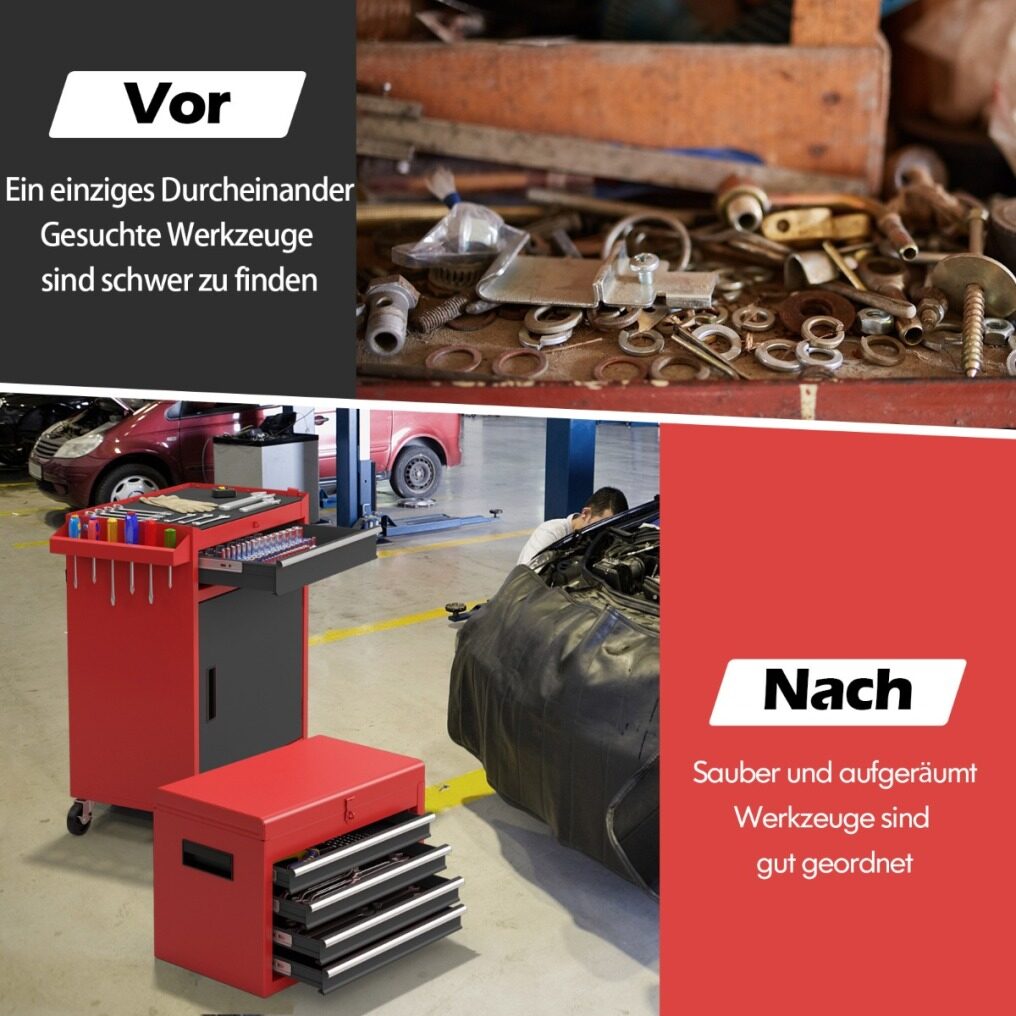 Perfect Tool Organizer: The upper chest with 4 drawers and a top compartment offers classified storage space for multiple tools. Also, the bottom cabinet with a drawer features a tool hanging board and 3-level adjustable inner shelf for additional storage space.