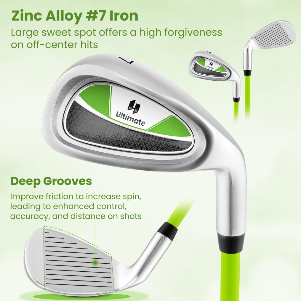 This #7 Iron boosts an aluminum alloy club head with a large sweet spot and deep grooves enhances forgiveness, control and distance. Paired with a premium fiberglass shaft for lightweight construction and enhanced flexibility, this junior golf iron features a soft rubber grip for comfort and control. Perfect as a gift for budding golfers, this meticulously designed club promotes a love for the game and supports the development of young athletes' golf skills and passion.