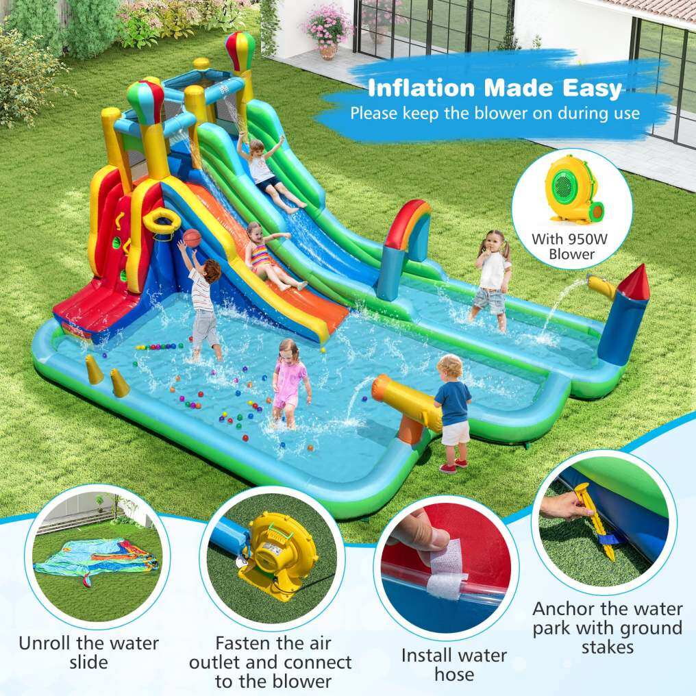 ● Inflation Made Easy: Setting up is a breeze with a 950W blower that inflates the park quickly and efficiently. Suitable for party, yard, or lawn, this inflatable water slide allows children to join in the excitement, creating memorable moments.