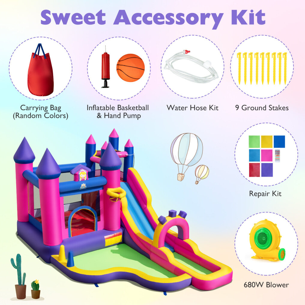 ● Full Party Kit Included: Inside the carton you'll find a 680W blower, a water-hose kit, a repair kit, a carrying bag, a mini-basketball and a hand pump so you're ready for spontaneous Saturday splash-offs. All nine ground stakes are tossed in as well, so you can anchor the unit before the kids even finish lacing their swimsuits.