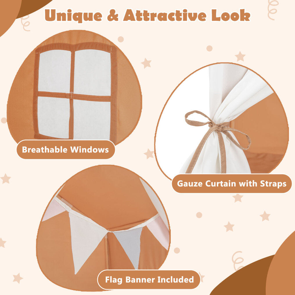 Kid's Play Tent with Washable Cotton Mat and Flag Banner-Light Brown