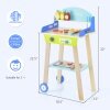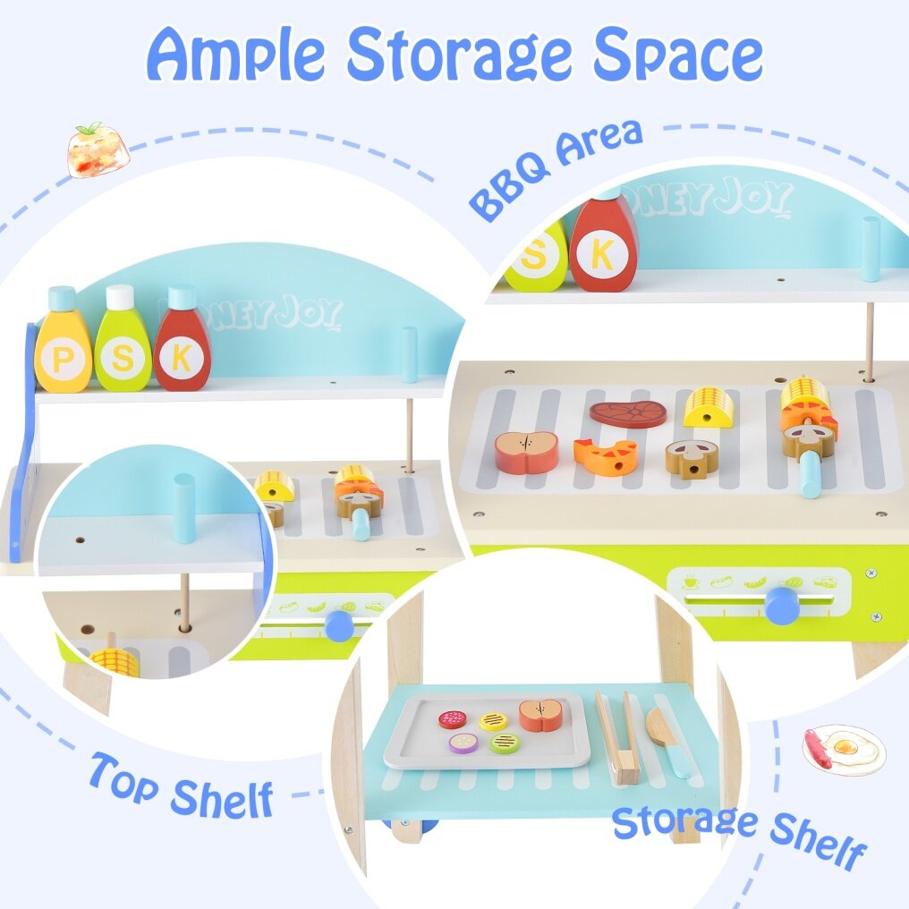 ● Sufficient Storage Space: There is a top shelf with 2 holes for condiments and skewers. The wide BBQ area is large enough to hold all barbecue food toys and tools. Apart from that, the bottom storage shelf offers added room. The classified storage space will help kids learn to organize different accessories.